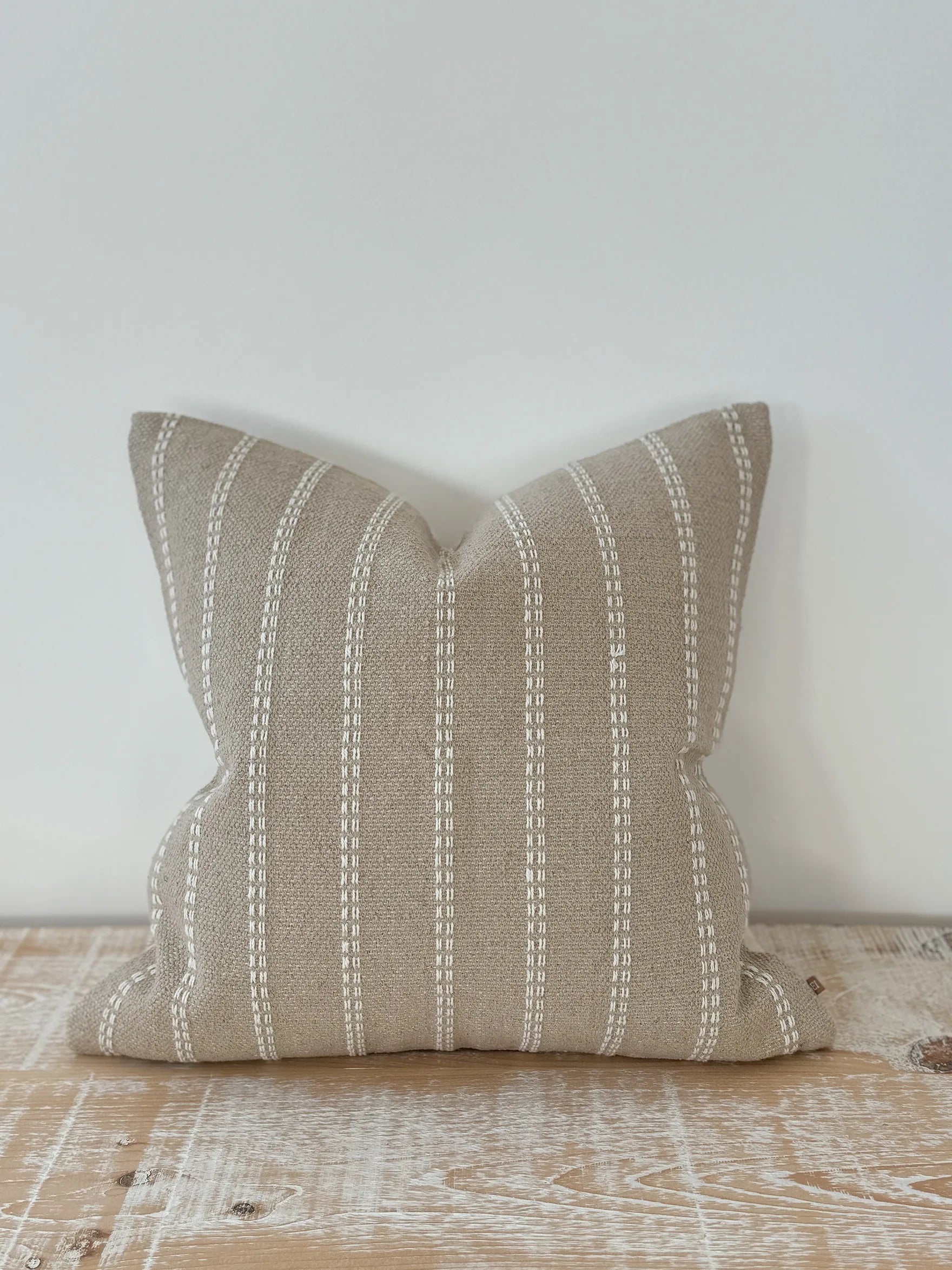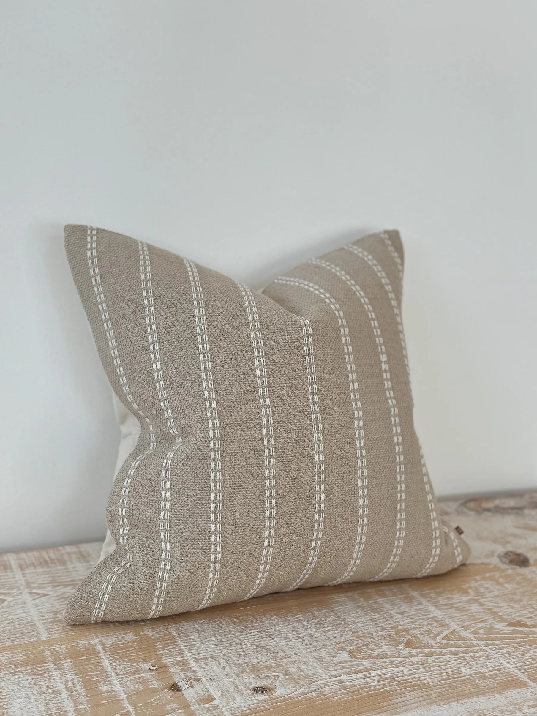 The Aspen Beige Cushion is beige with a cream stripe on the front of the cushion and has an oatmeal back.