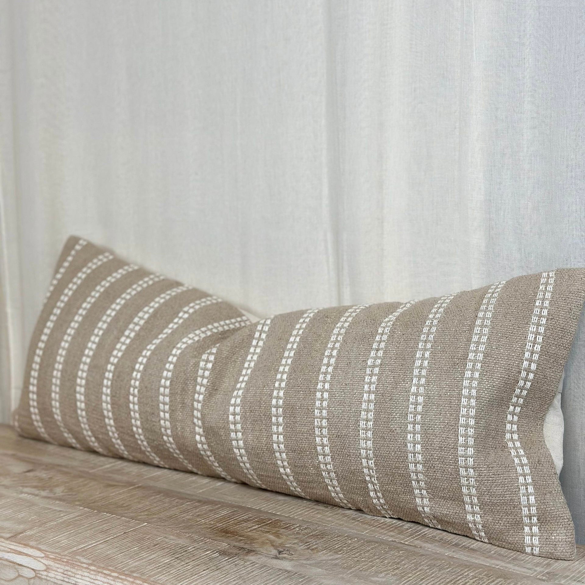 Ideal for adding the finishing touch to a bed, the Aspen Bolster Cushion is beige with a cream stripe. It comes complete with a feather cushion insert.