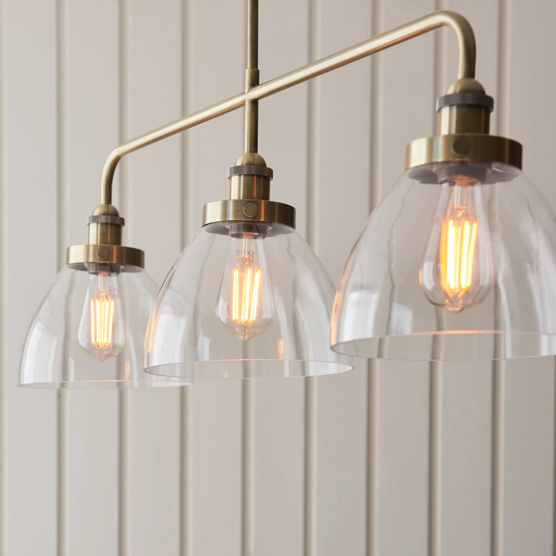 The Baxter Linear 3 Pendant Light is an industrial style linear pendant with adjustable height stem, great for dinning rooms and kitchens. Antique brass finished metalwork with knurled details and clear glass shades.