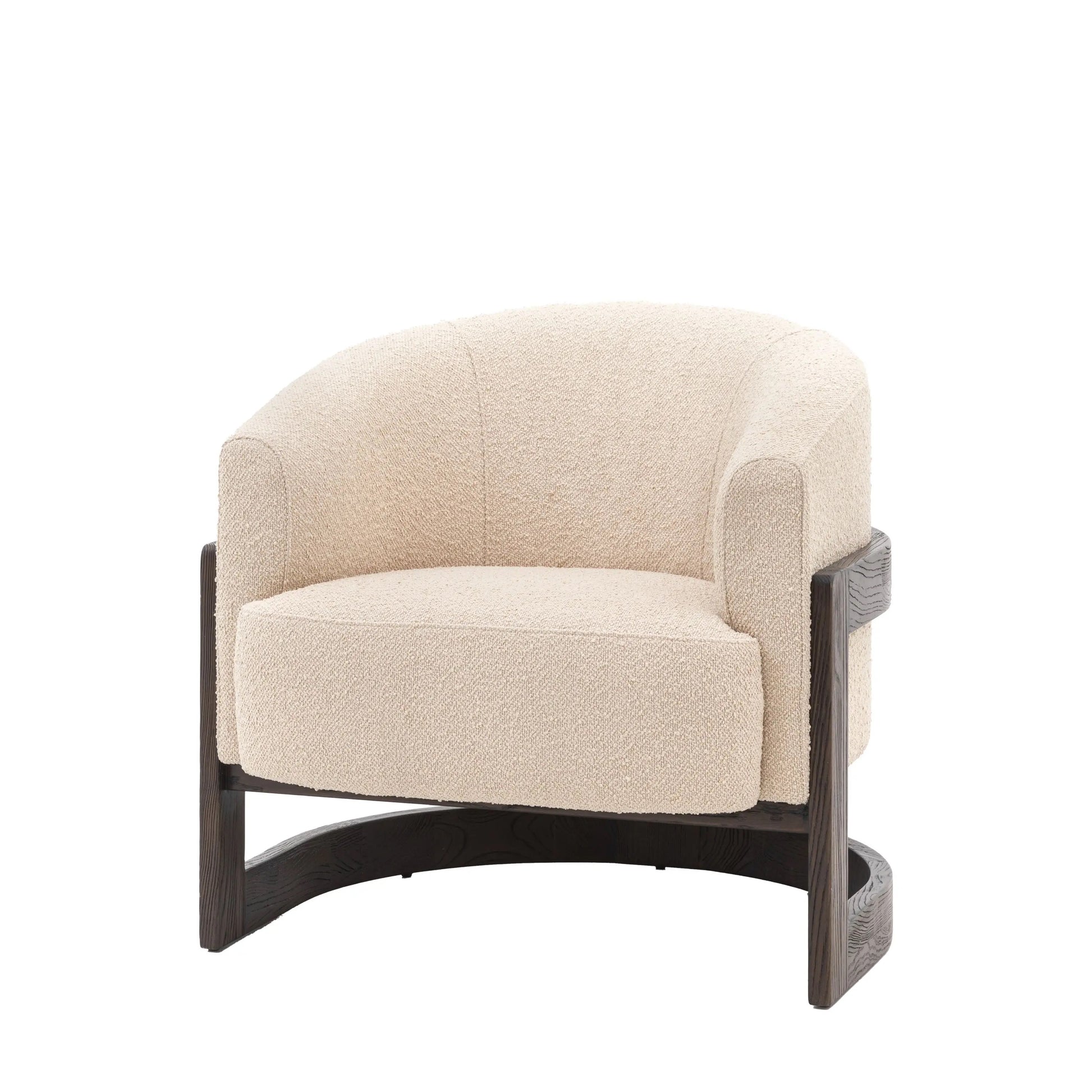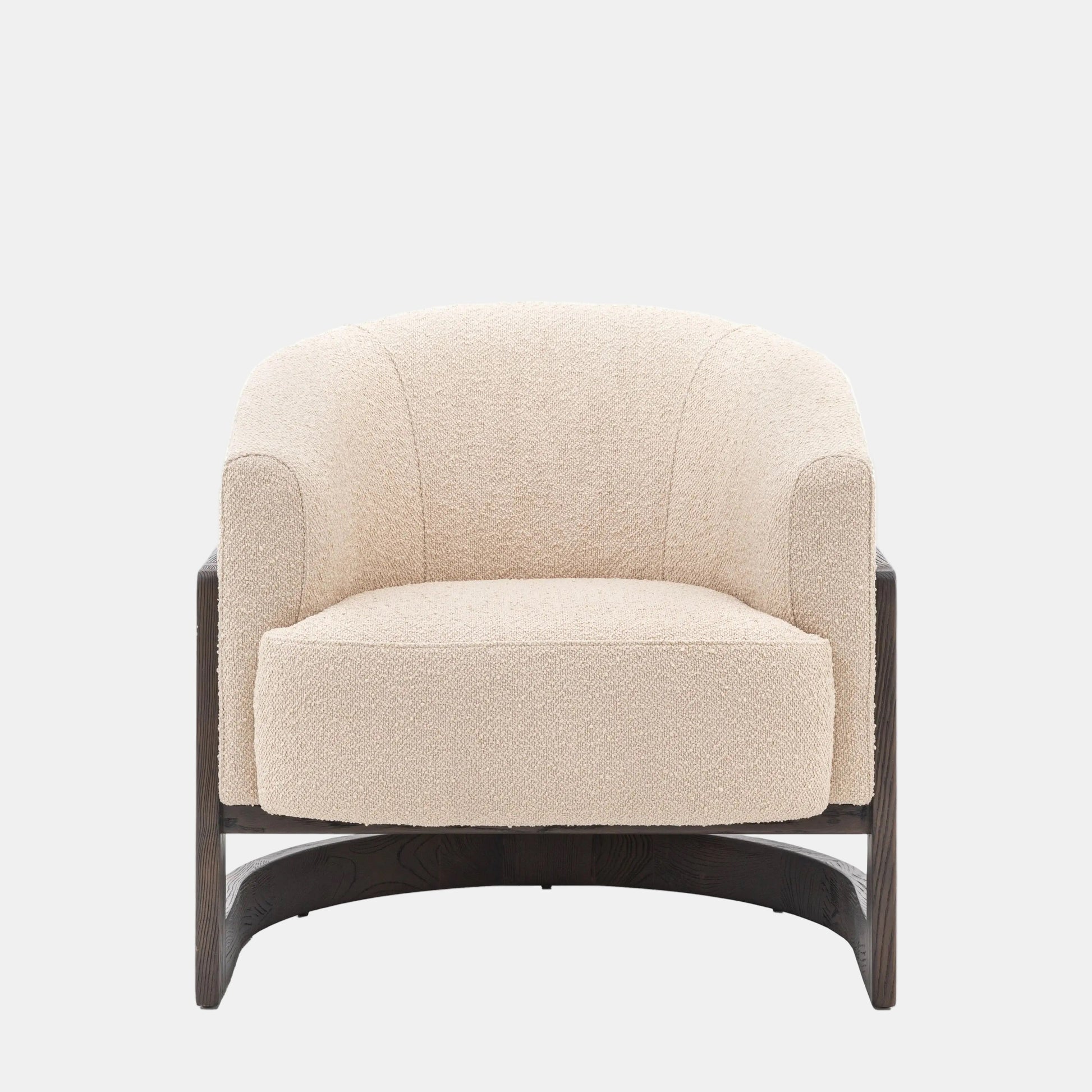 The Bower Armchair blends timeless design with modern comfort, featuring a curved backrest, plush cushioning, and a dark wood frame for added sophistication. Upholstered in soft, textured fabric, it complements both contemporary and classic interiors.