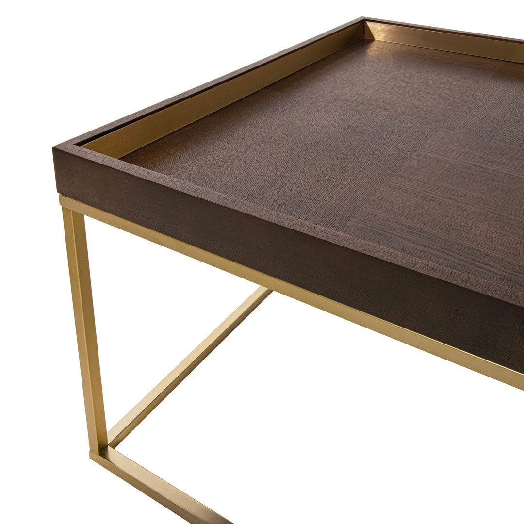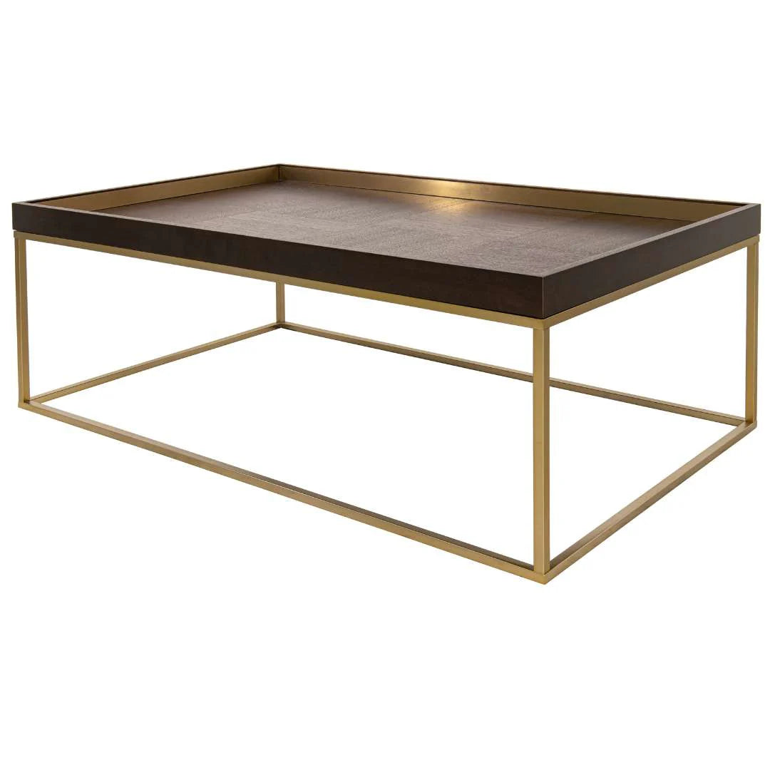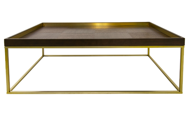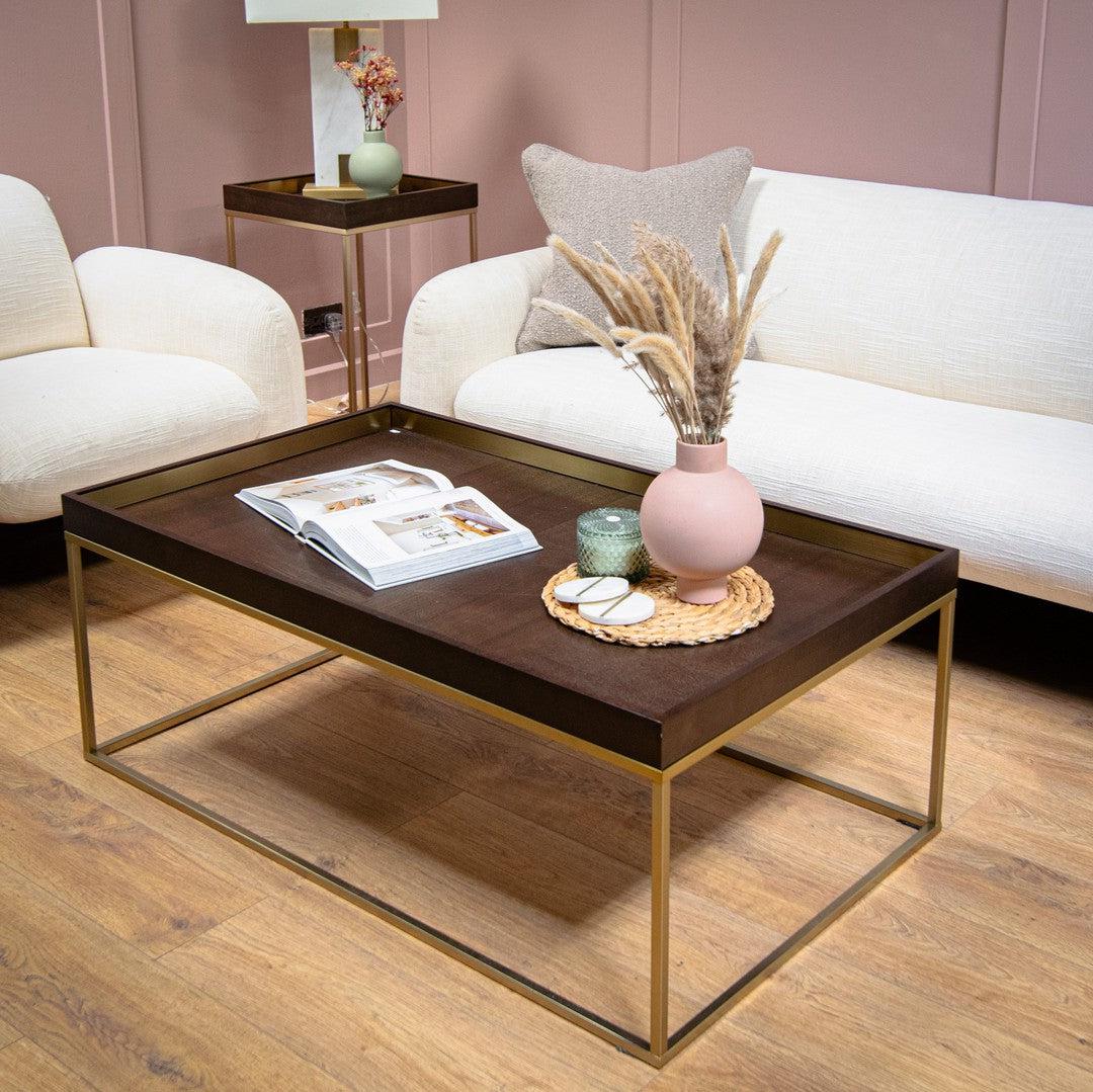 The Brook Coffee Table is a useful size for many interior settings. The geometric stand is a beautiful satin champagne topped with a rich chocolate top, a timeless style that will work great in any interior setting. Perfect for placing in a living room or bedroom.