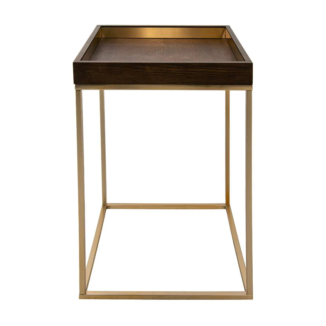 The geometric stand of the Brook Side Table is a beautiful satin champagne topped with a rich chocolate top, a timeless style that will work great in any interior setting. Perfect for placing in a living room next to a sofa, in a snug or as a bedside table.