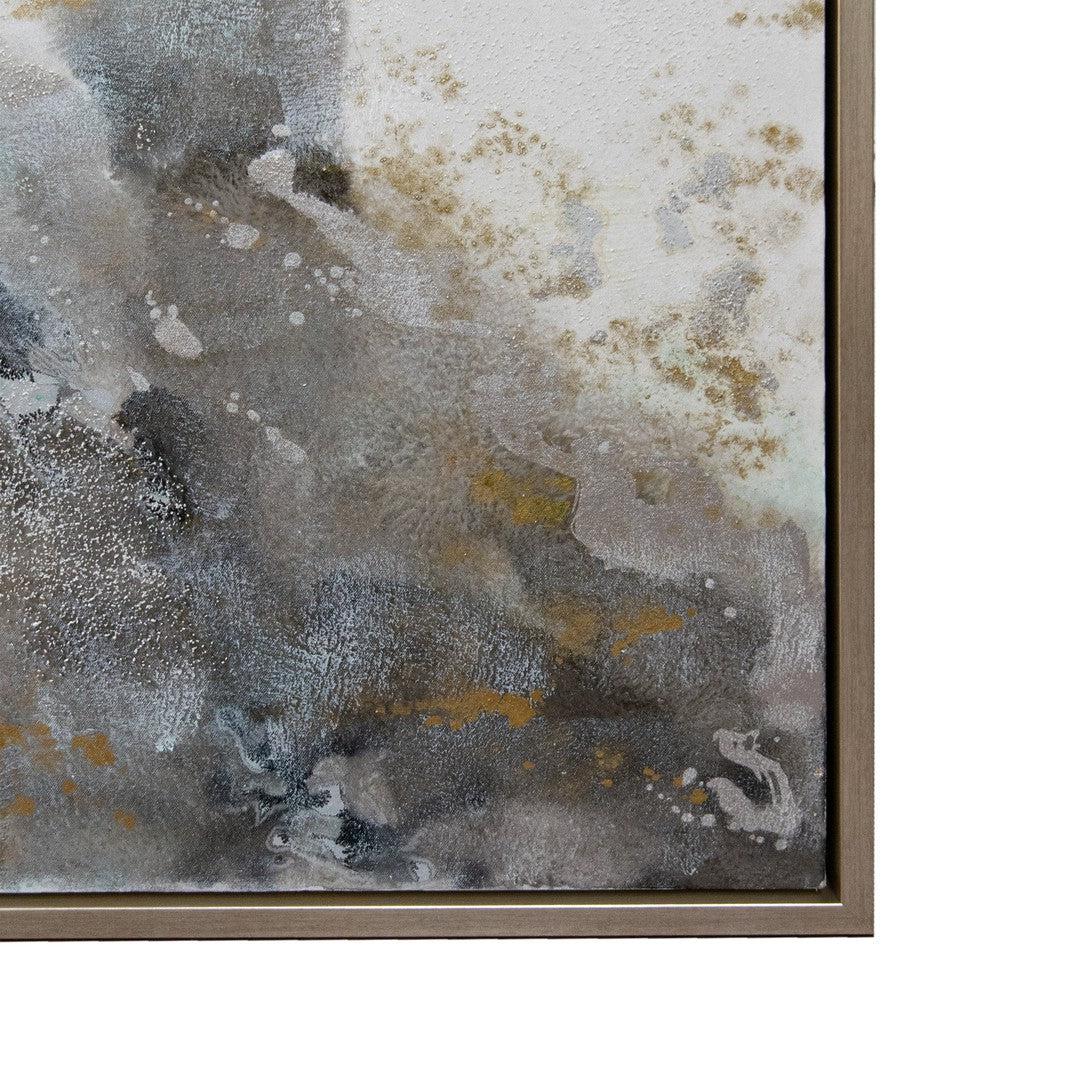 This canvas is a mesmerizing abstract artwork that evokes the mystique and wonder of a distant nebula. This piece features an enchanting blend of blue, grey, gold, and neutral tones, creating a celestial and dreamy atmosphere. The cool blues and greys bring a sense of calm and depth, while the gold accents add a touch of brilliance and sophistication. The neutral hues provide a harmonious balance, enhancing the overall tranquillity of the composition. Framed in an elegant champagne frame, this canvas is a perfect addition to a contemporary living room, a serene bedroom, or a stylish office, offering a touch of cosmic elegance and modern allure to any space.