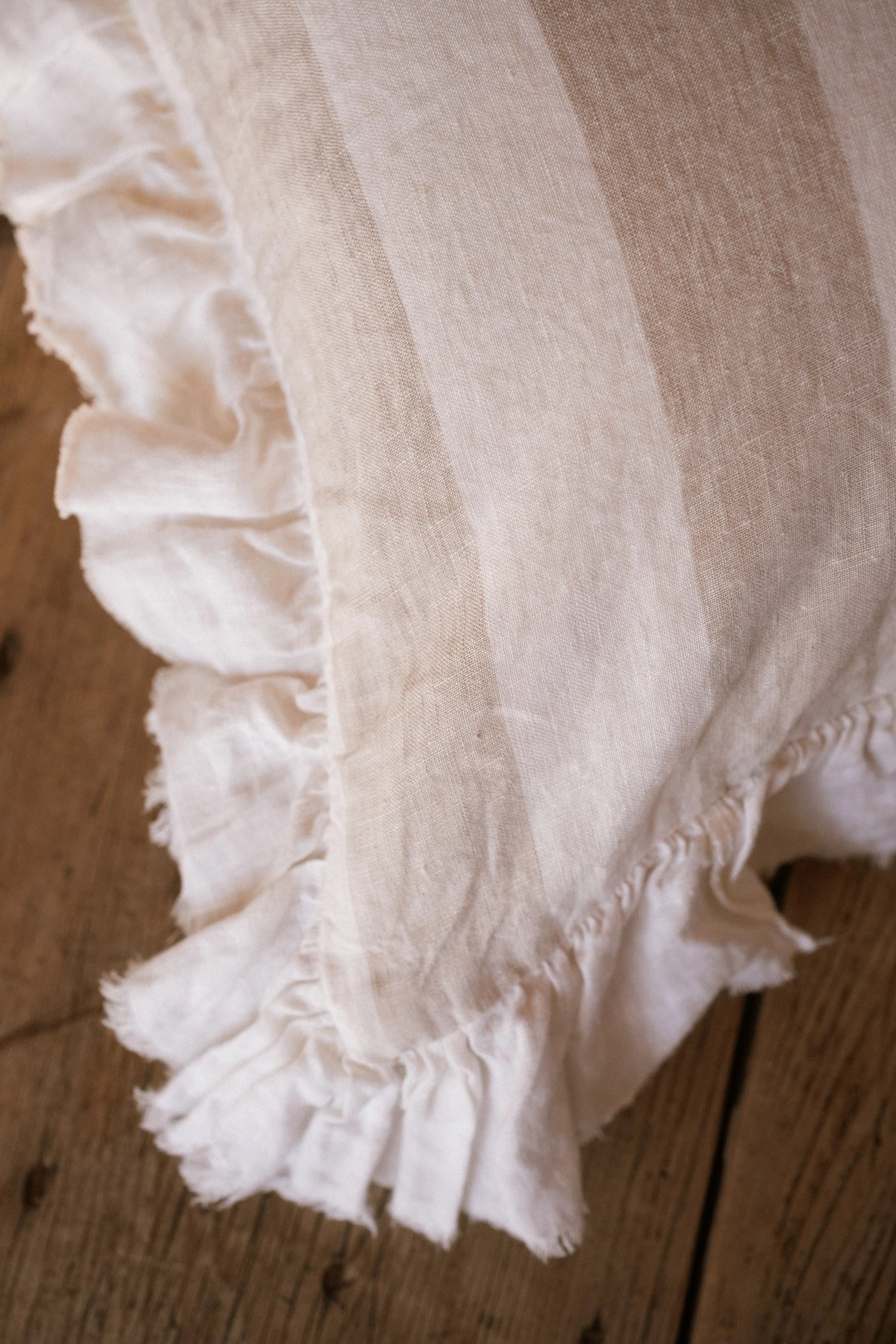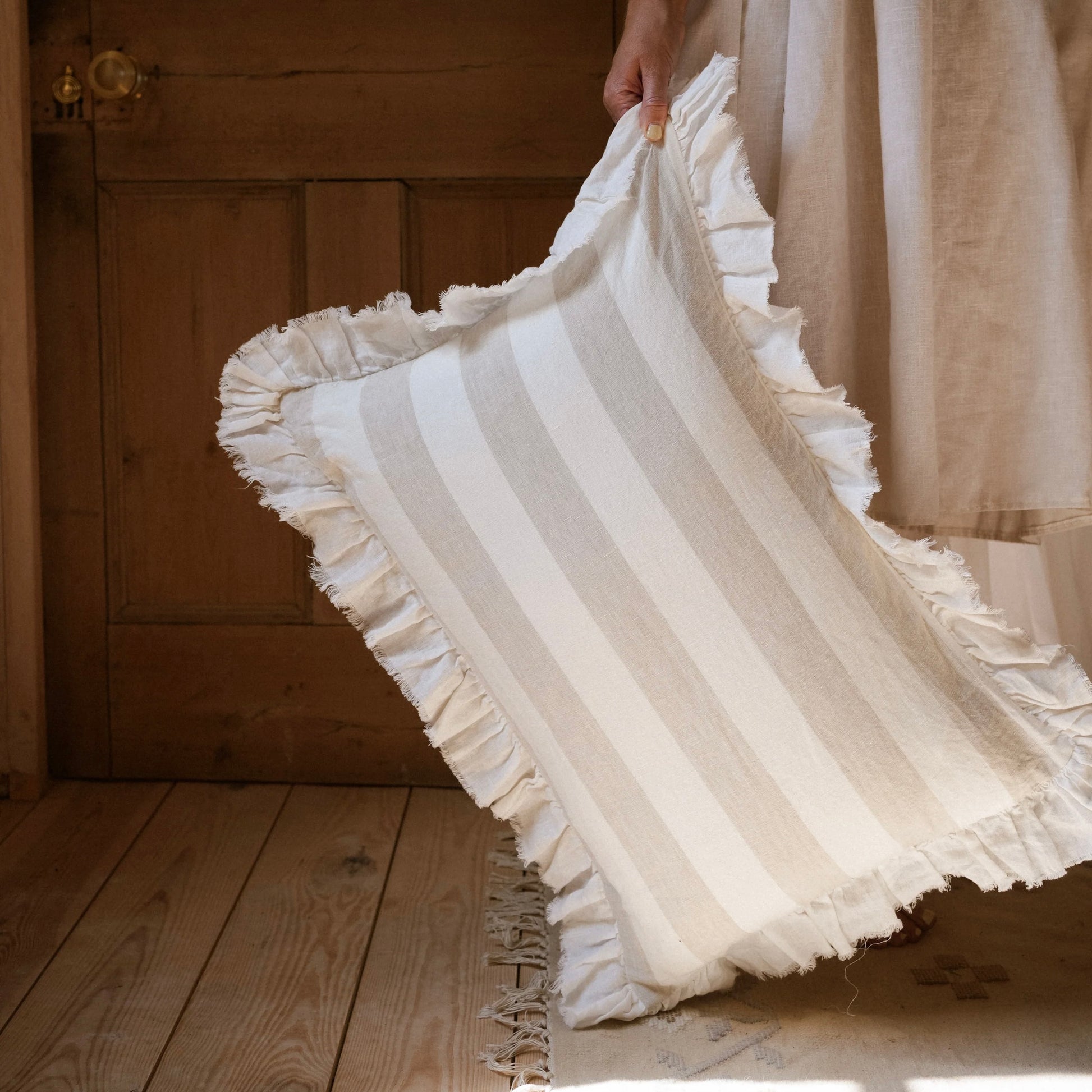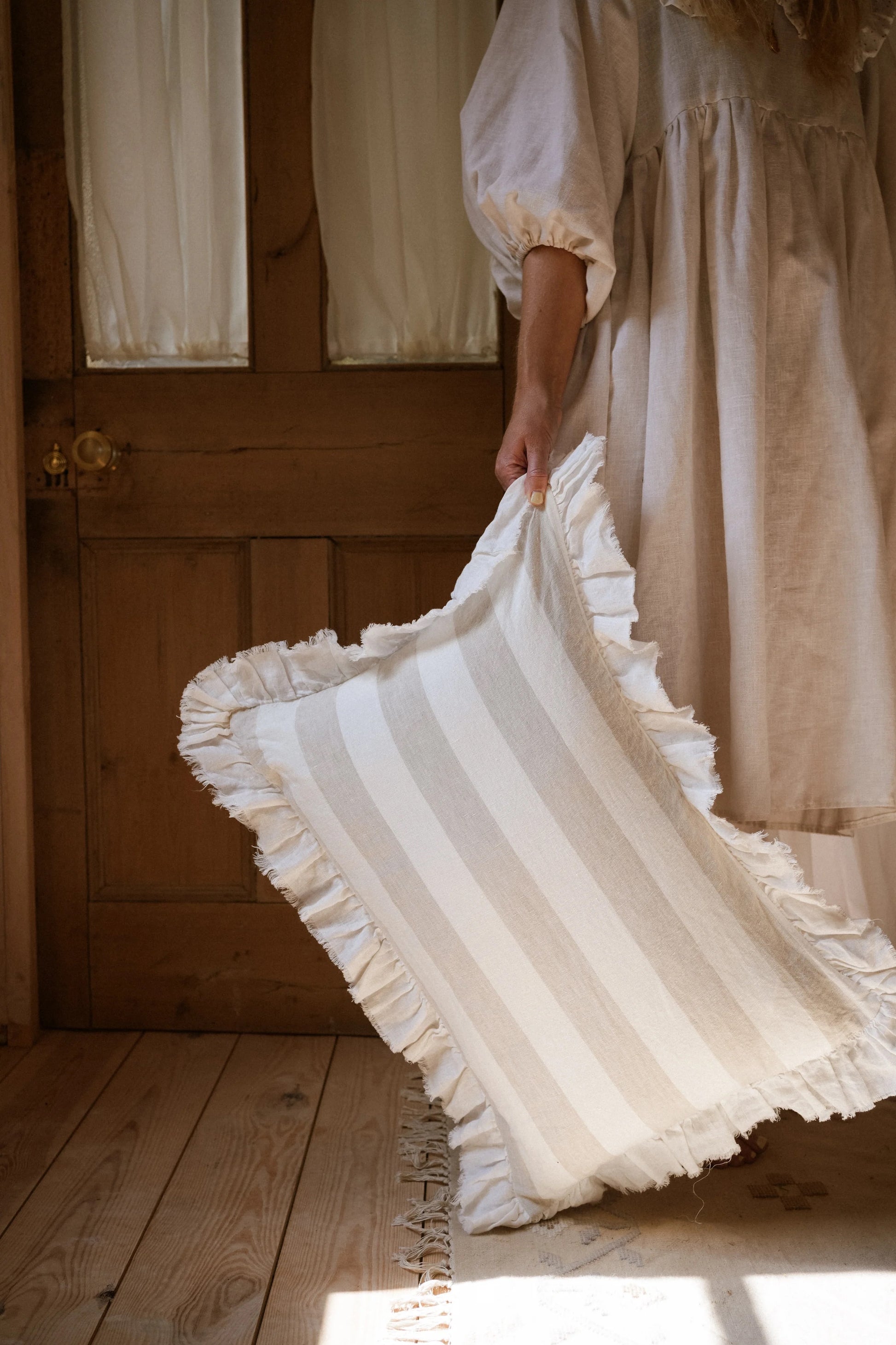 With a nod to the nostalgic charm of broad seaside stripes, this timeless piece makes a striking statement in the home. Crafted from 100% French flax linen, its classic design evokes memories of serene coastal retreats, bringing a sense of tranquility and elegance to any space. Whether placed in a cosy corner or as a focal point in a room, this cushion effortlessly combines style and comfort, making it a cherished addition to the home. It comes complete with a luxury feather insert.