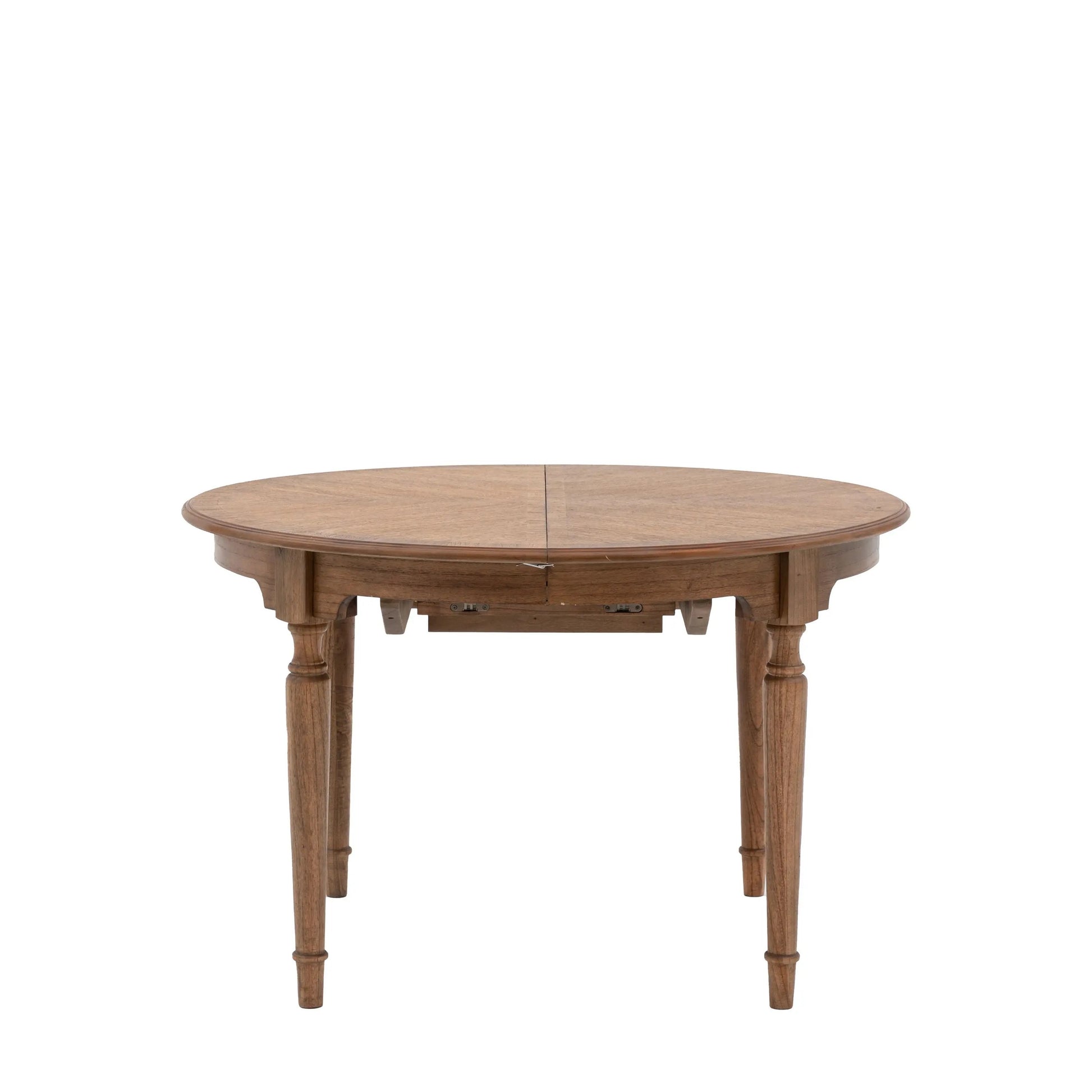 Designed to offer a 'new traditional' look with its timeless elegant style with a modern touch, this stunning table will add a sophisticated look to a room. The beautiful rich tonal mid brown Mindy wood solids & veneers feature in inlaid book-matched and marquetry details. For added practicality the table extends with butterfly centre leaves, so it can comfortably seat up to 6 people.