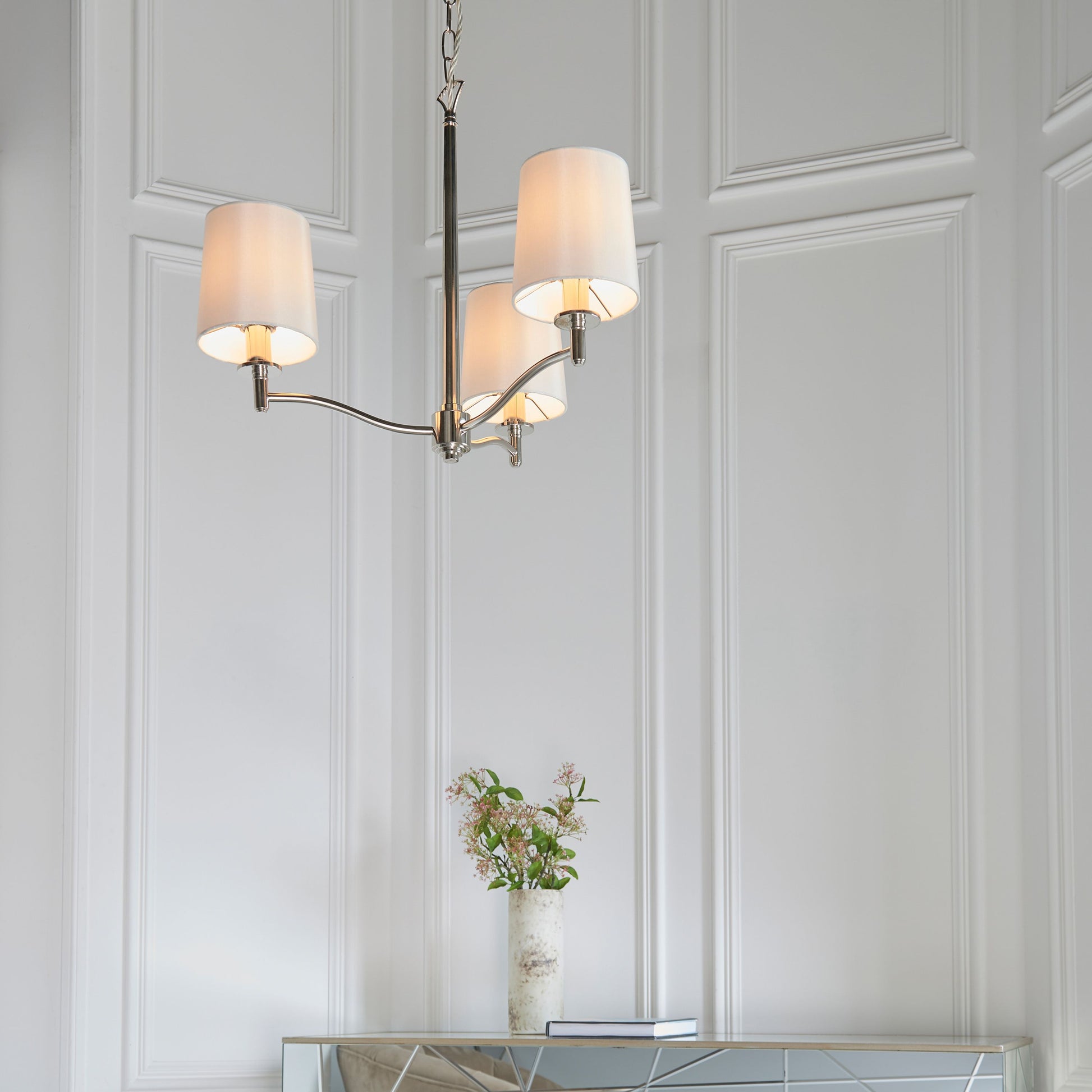 The Colton 3 light pendant is finished with a nickel effect plate with vintage white faux silk shades. This fitting has an adjustable drop, is dimmable and suitable for use with LED lamps.