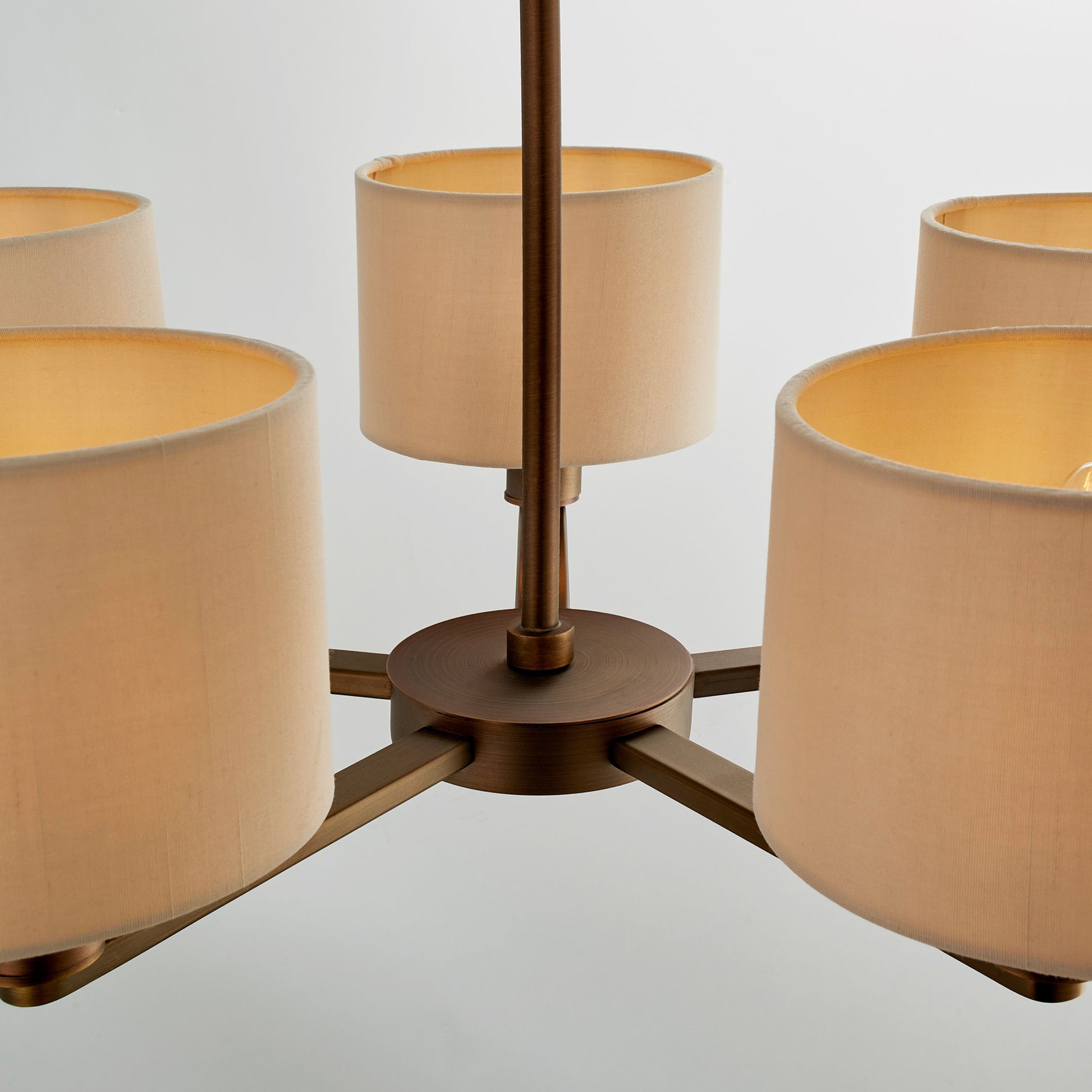 An understated modern 5 light pendant, mixing a sophisticated dark antique bronze plated finish with marble faux silk shades.