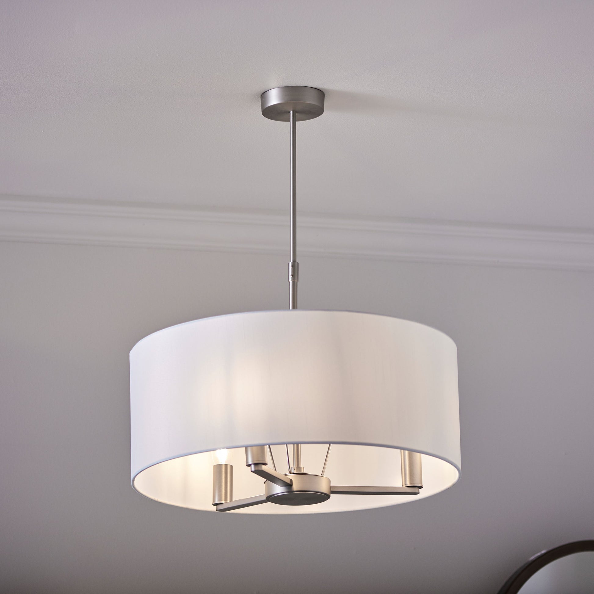 An understated modern 3 light pendant, mixing a subtle brushed plated finish with a large timeless vintage white faux silk shade.
