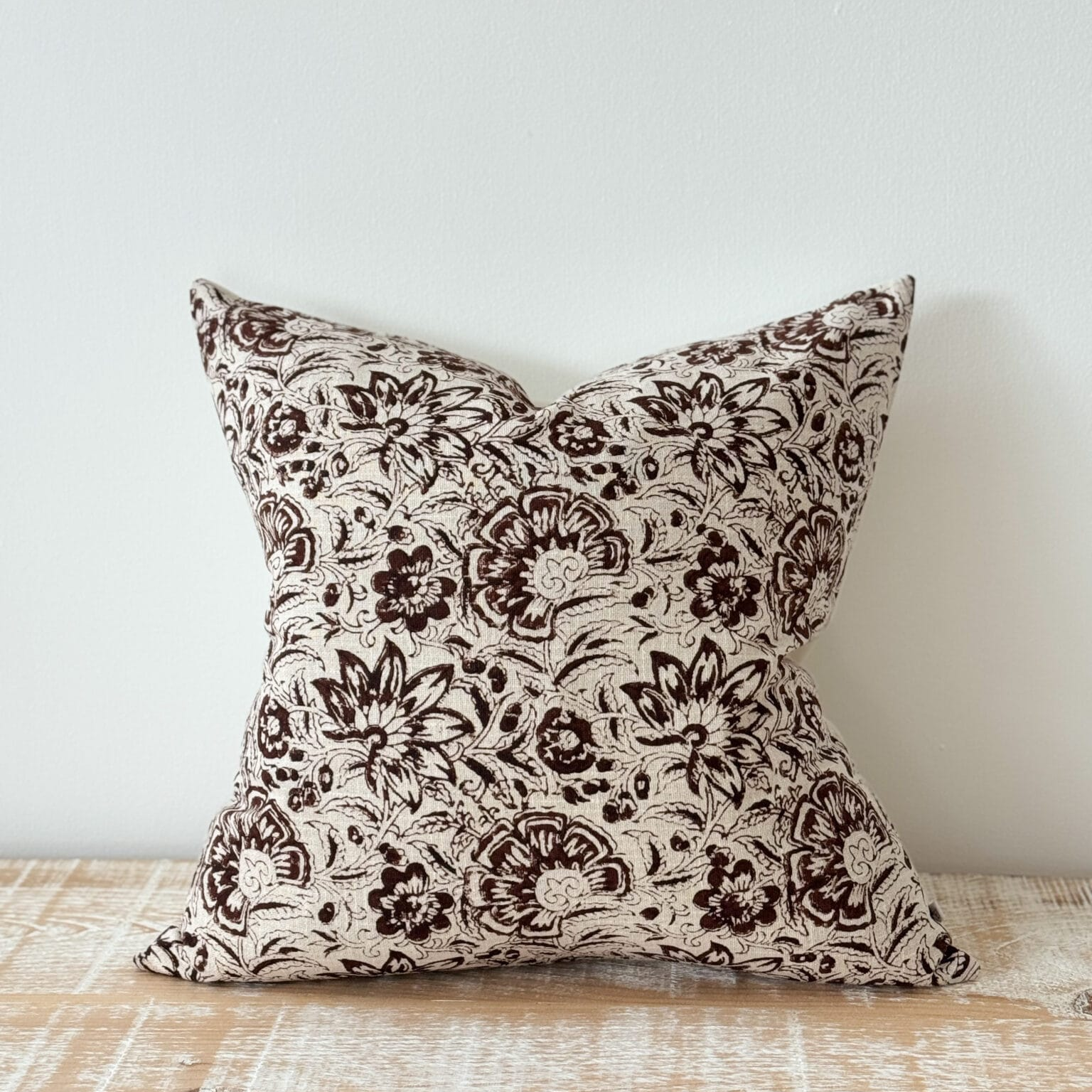 The Ella dark brown cushion cover has a stylish floral print design. The cushion cover has a plain oatmeal coloured back.