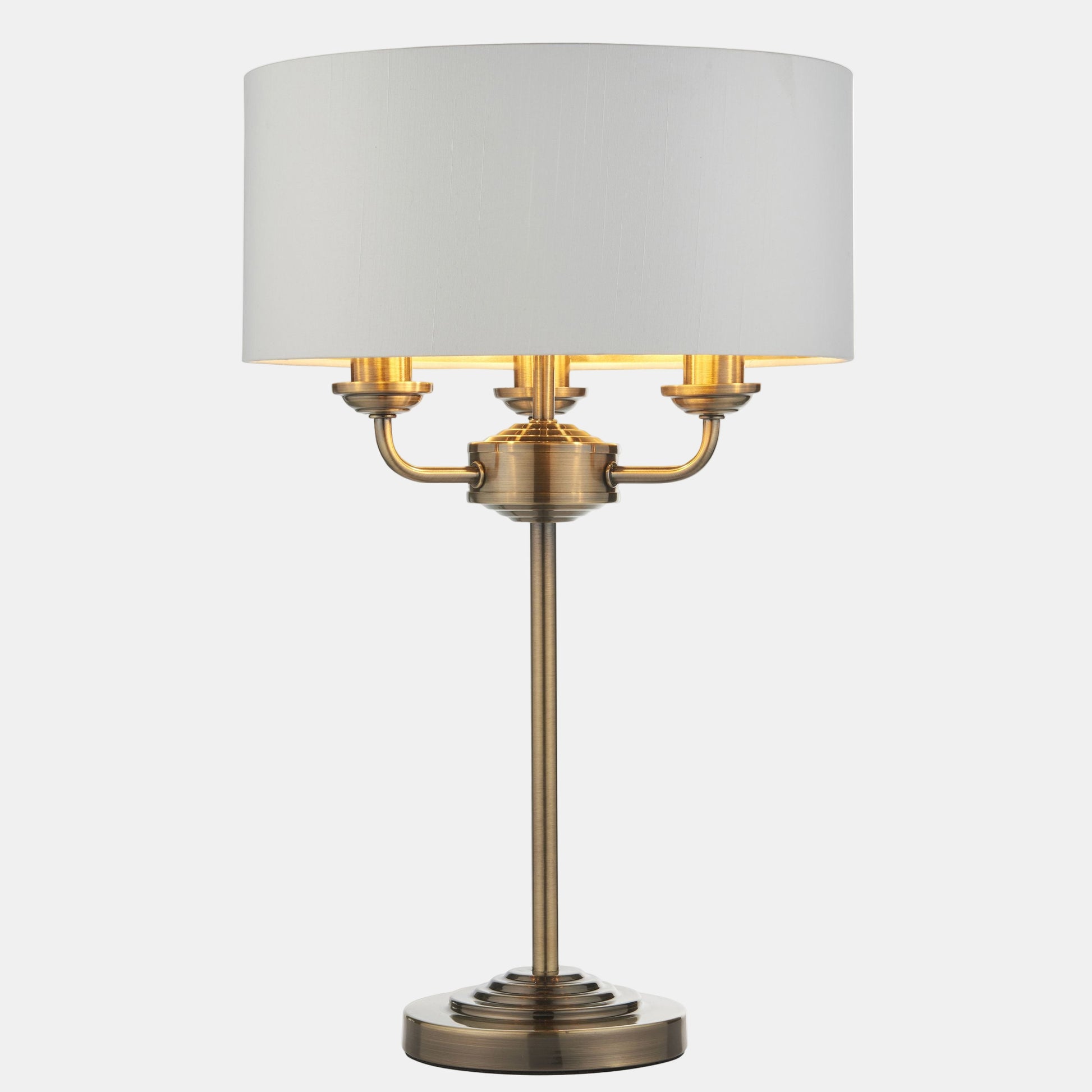 Our Galway 3 Light Table Lamp is a sophisticated mix of a vintage white fabric shade lined with gold metallic inner and antique brass plated metalwork. This statement light is the perfect timeless addition to modern and classic homes.