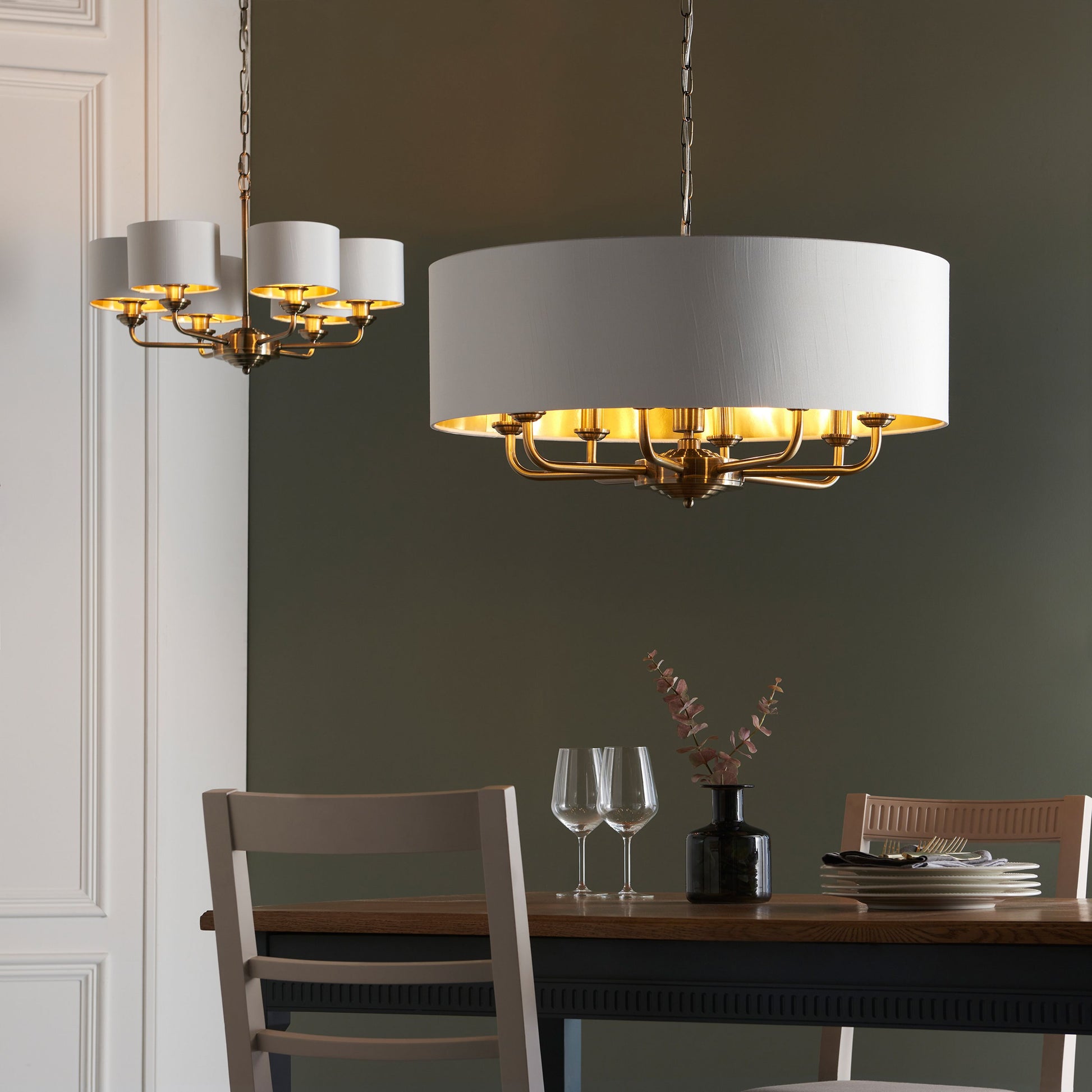 The Galway pendant has a sophisticated mix of vintage white fabric shade lined with gold metallic inner and antique brass plated metalwork. This statement light is the perfect timeless addition to modern and classic homes of today.