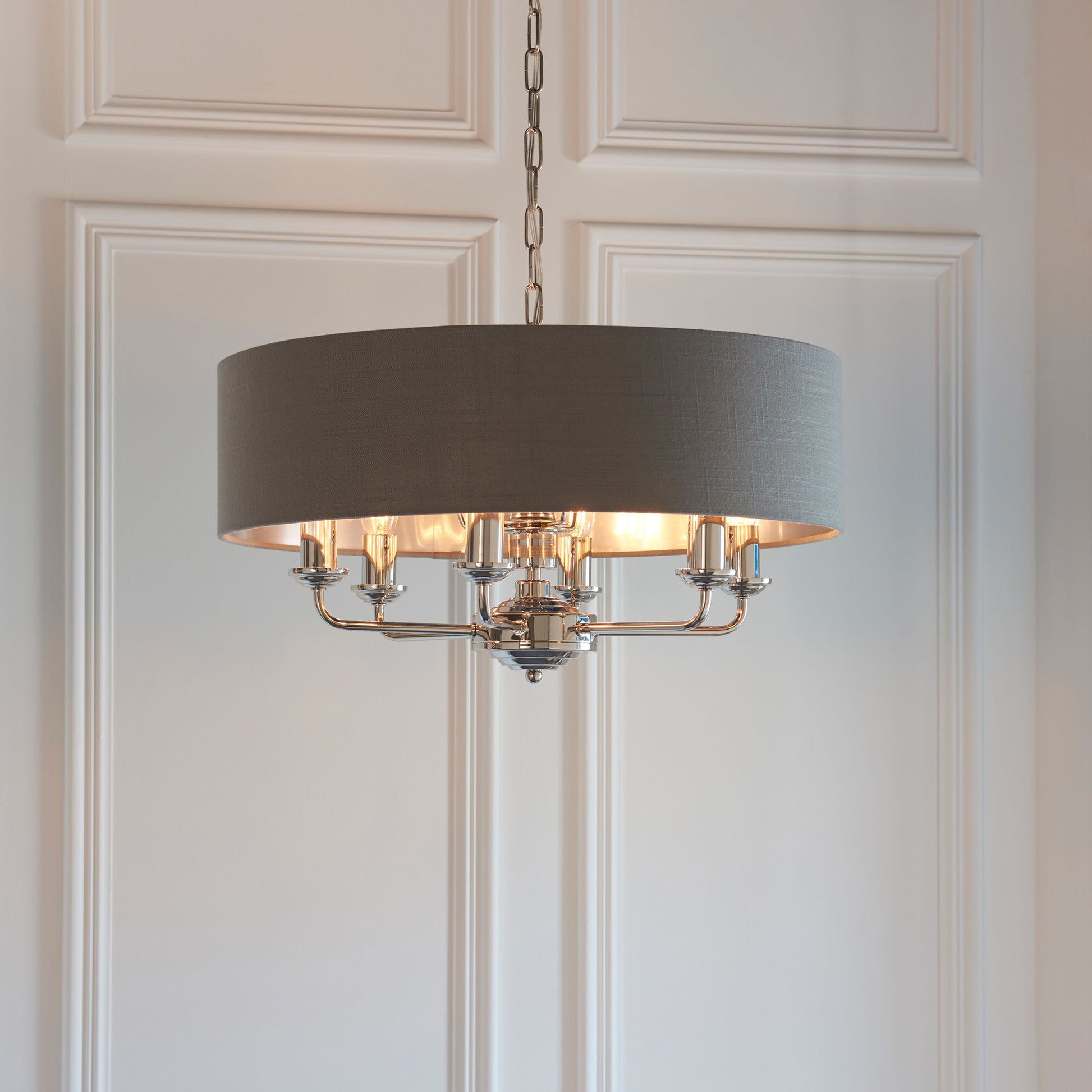 The Galway 8 pendant light has a sophisticated combination of charcoal linen mix fabric shade with a reflective brushed metallic inner and brushed chrome metalwork. This statement light is the perfect timeless addition to modern and classic homes.
