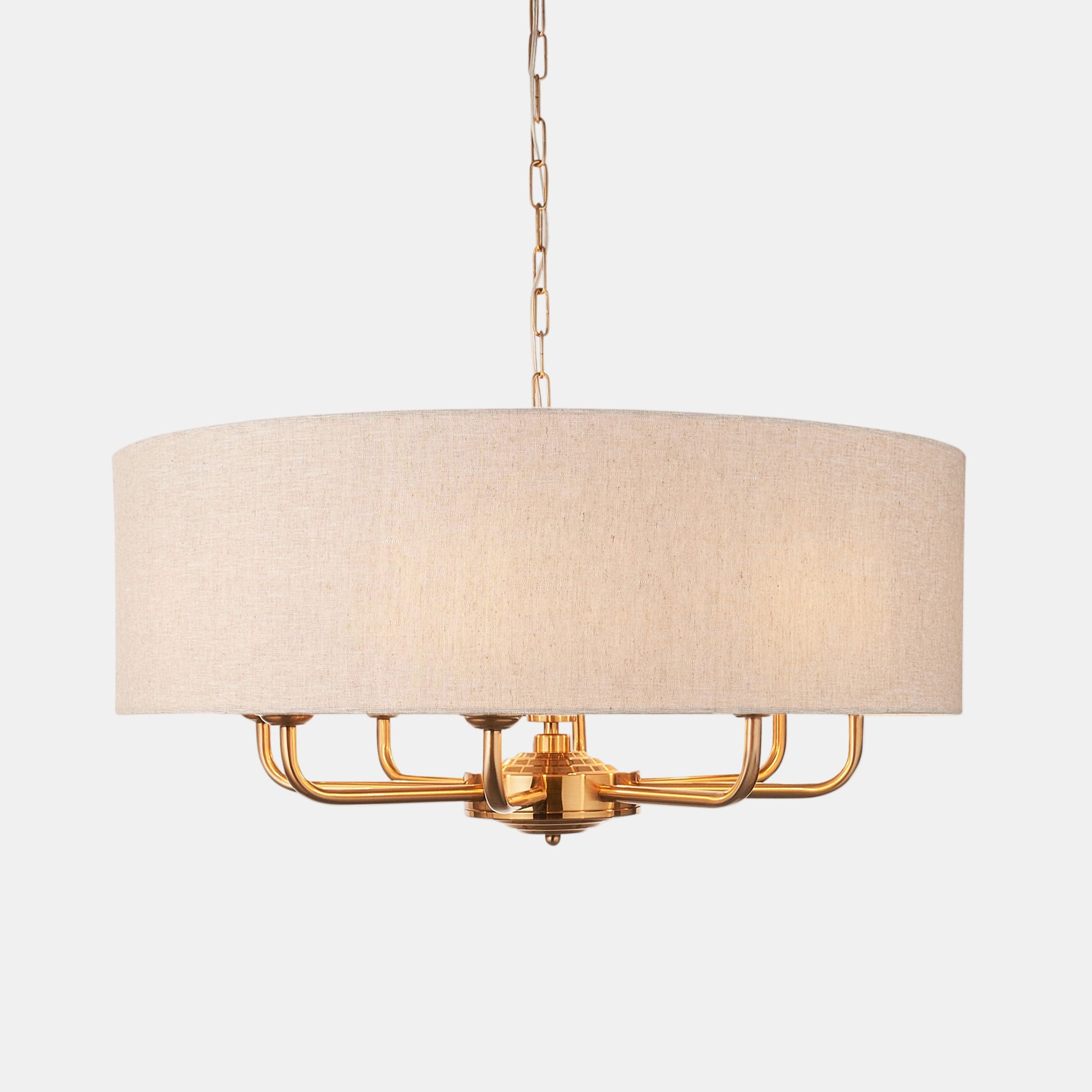 The Galway 8 light pendant has a sophisticated mix of a single large natural linen fabric shade, with matching colour cotton inner and vintage brass plated metalwork. This statement light is the perfect timeless addition to modern and classic homes.