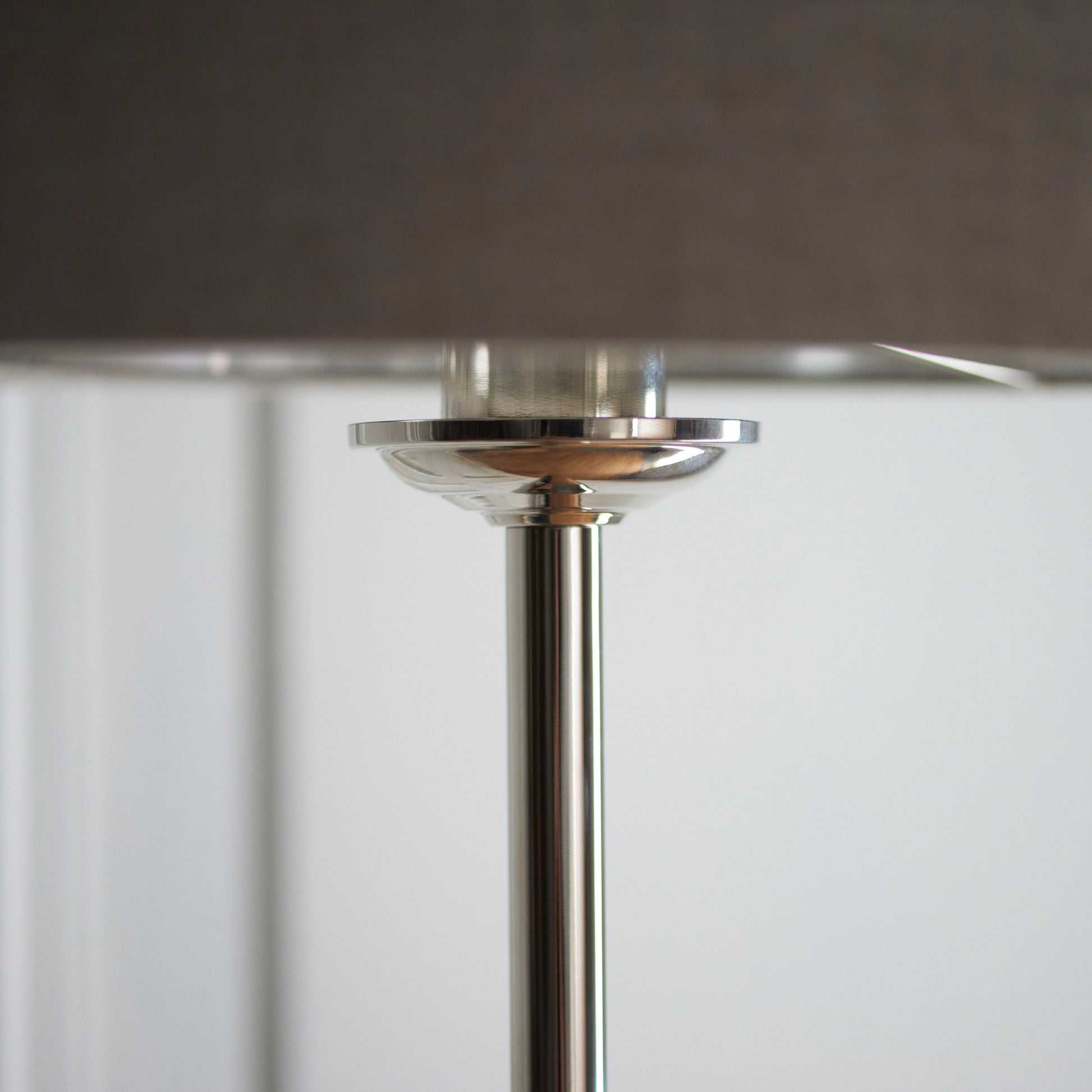 The Galway floor lamp is a sophisticated mix of natural linen fabric with a reflective brushed metallic inner and brushed chrome metalwork.
