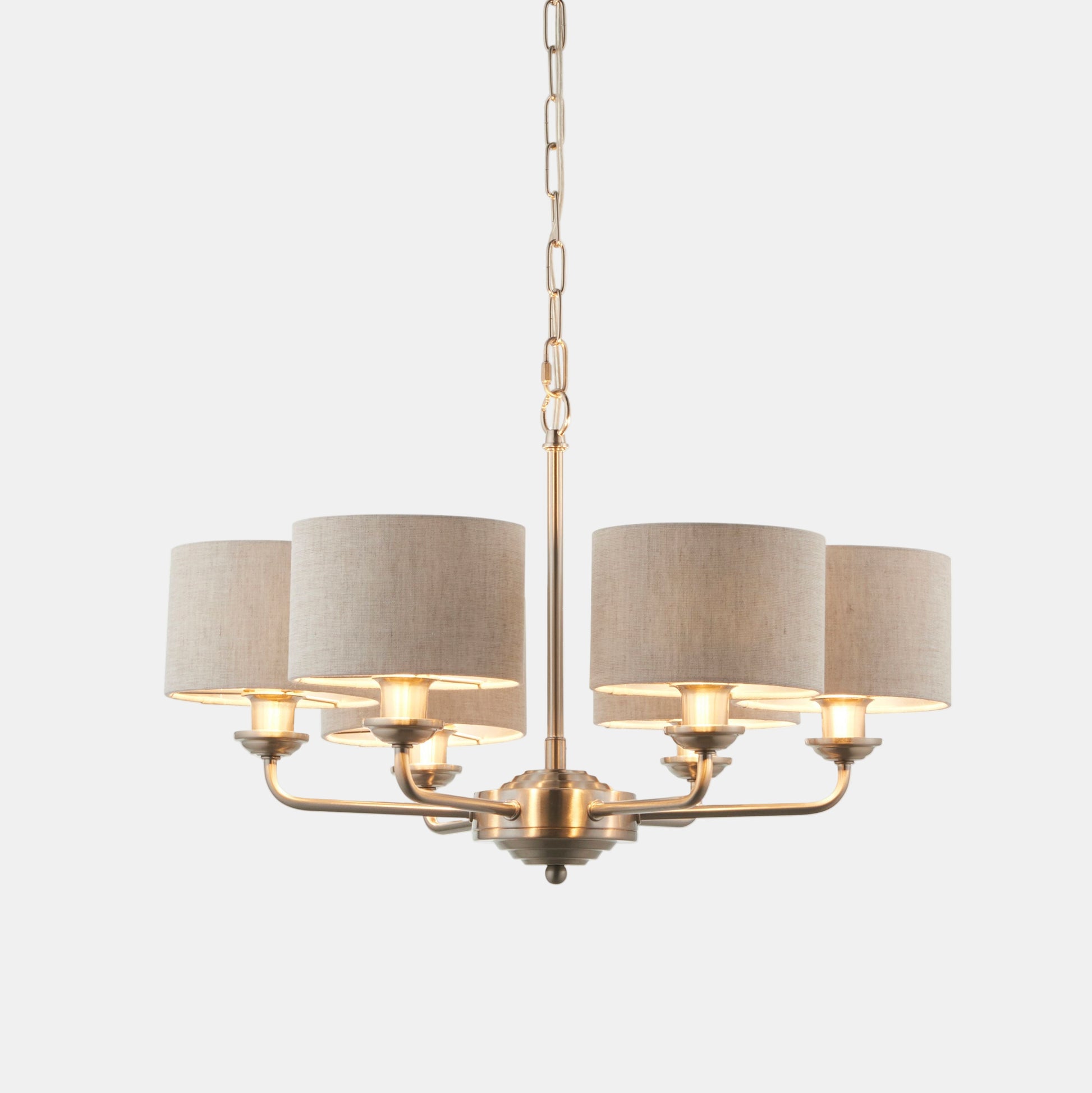 The Galway multi arm pendant is a sophisticated combination of Natural 100% linen fabric shades with brushed metallic inner and brushed chrome plated metalwork. This statement light is the perfect timeless addition to both modern and classic homes.