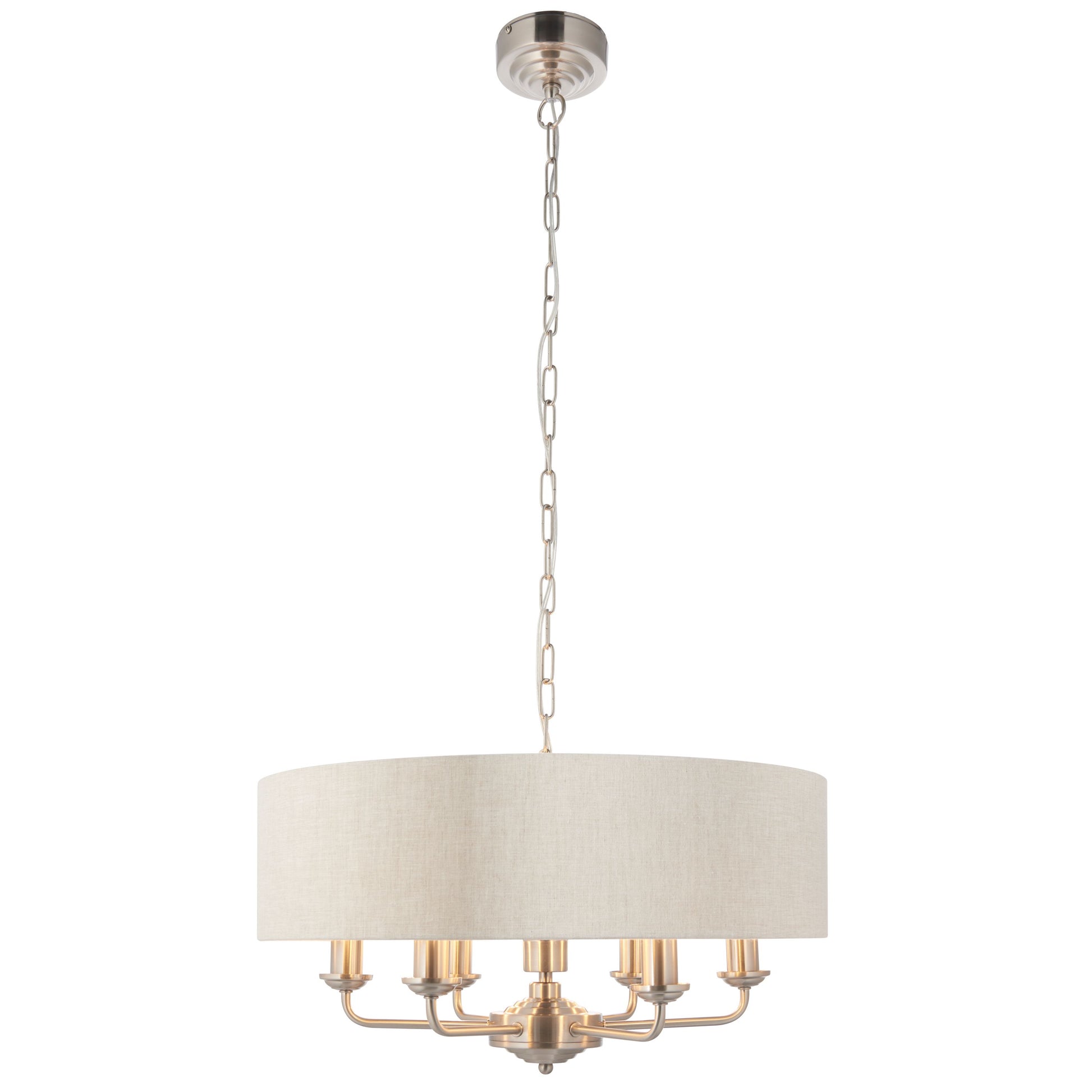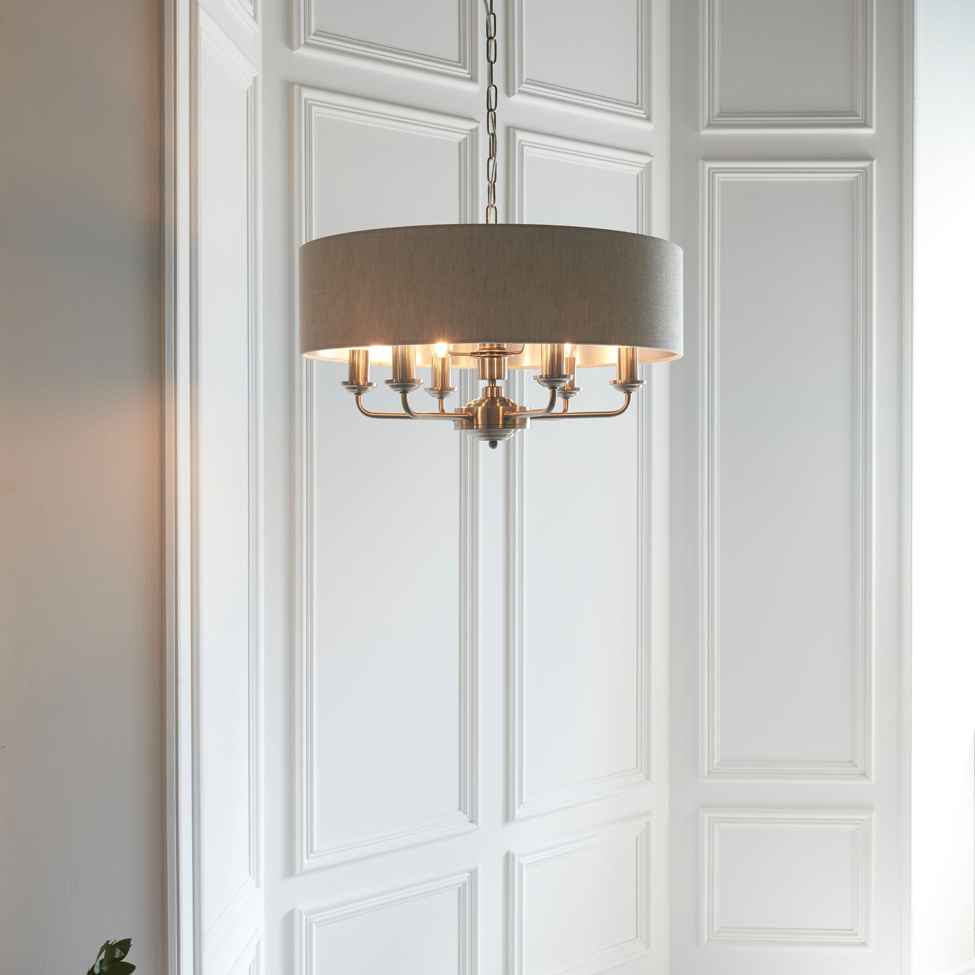 The Galway pendant is a sophisticated mix of natural linen fabric with a reflective brushed metallic inner and brushed chrome metalwork. This beautiful pendant is the perfect timeless addition to modern and classic homes of today.