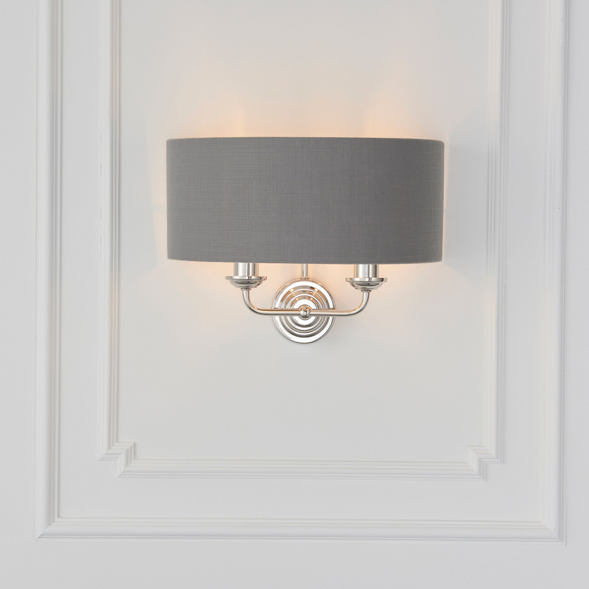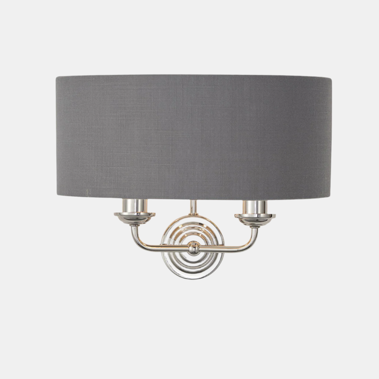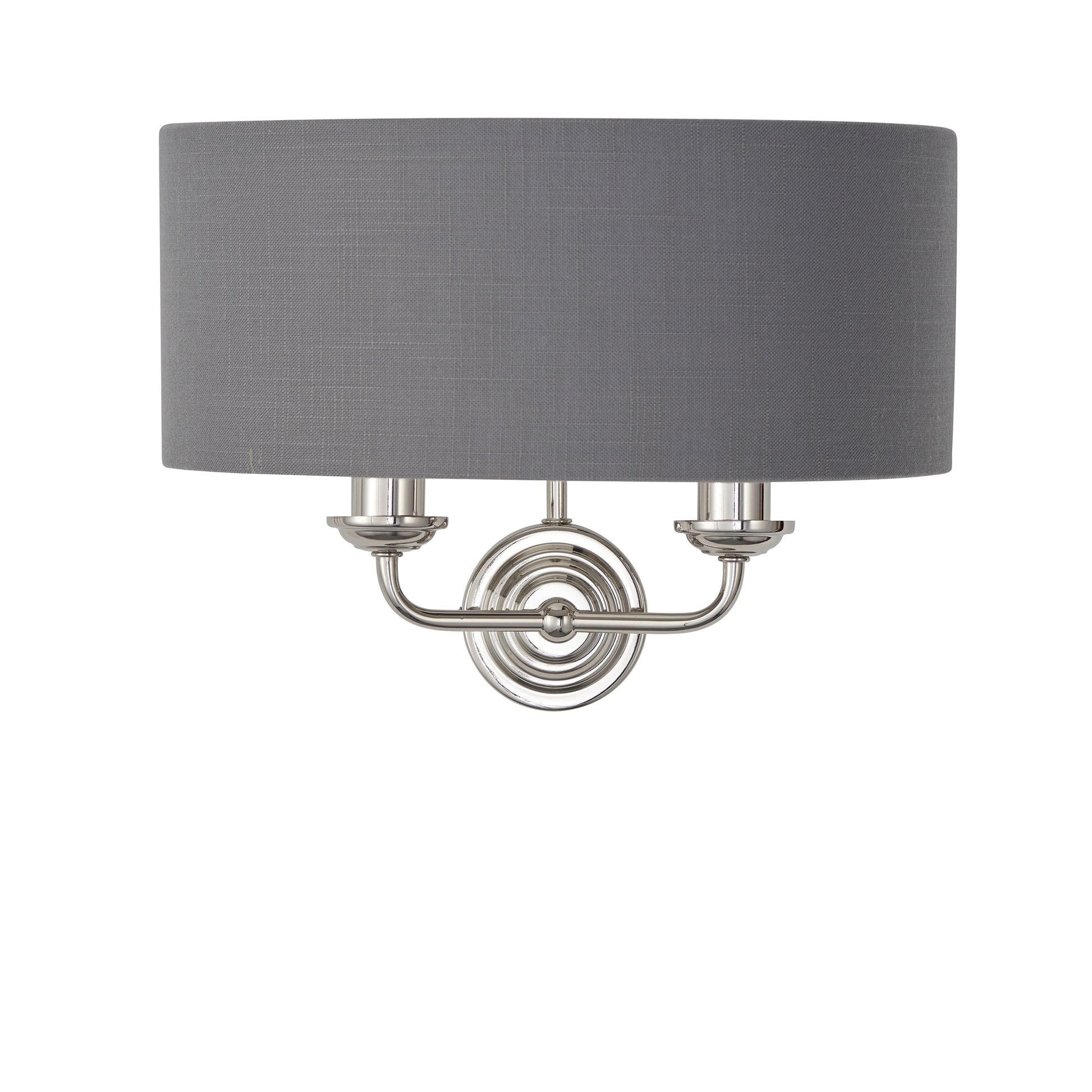 The Galway twin wall light is a sophisticated combination of charcoal linen mix fabric with a reflective brushed metallic inner and bright nickel metalwork. This statement wall light is the perfect timeless addition to modern and classic homes.