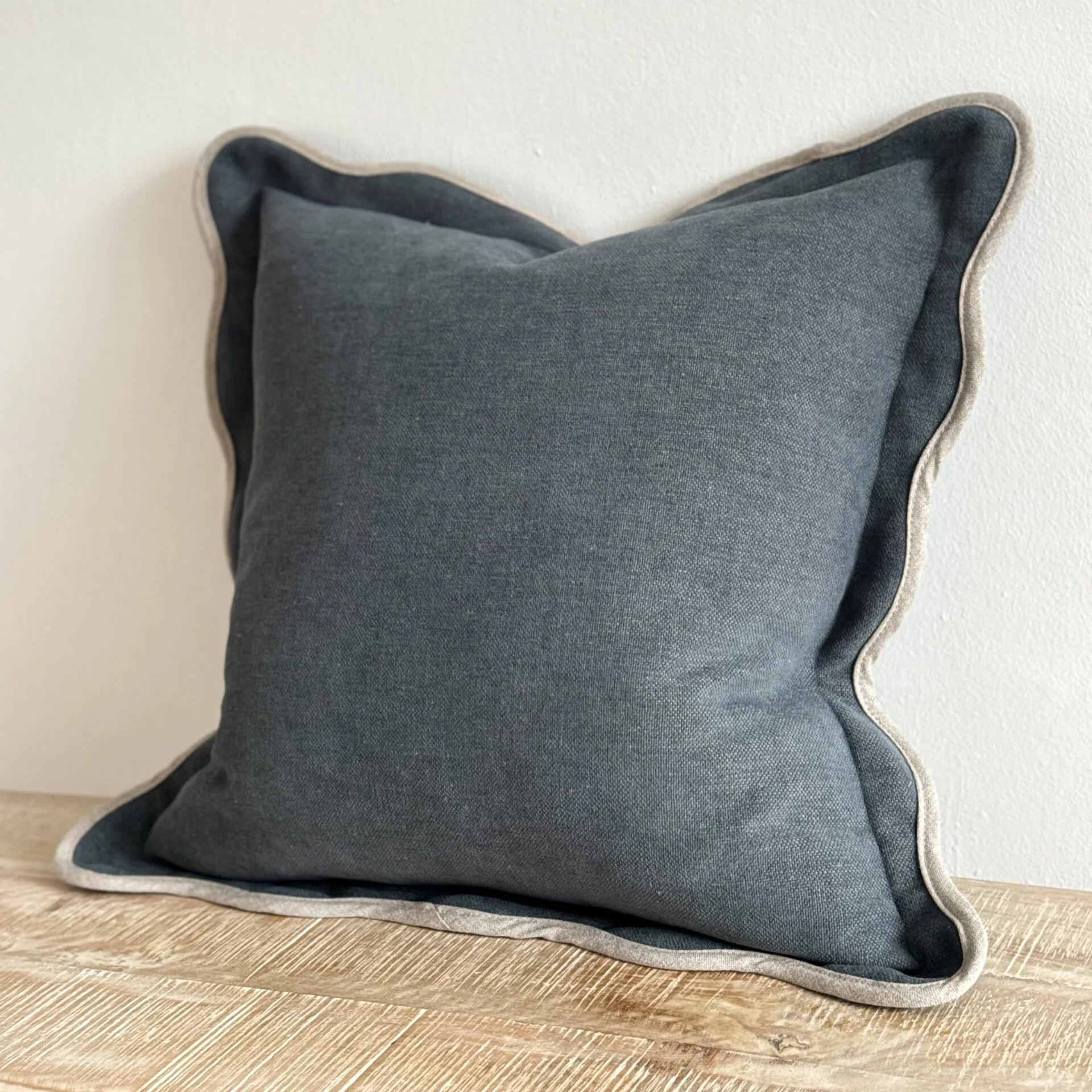The Georgia is a blue cushion cover with a beautiful scalloped edge with a cream trim.