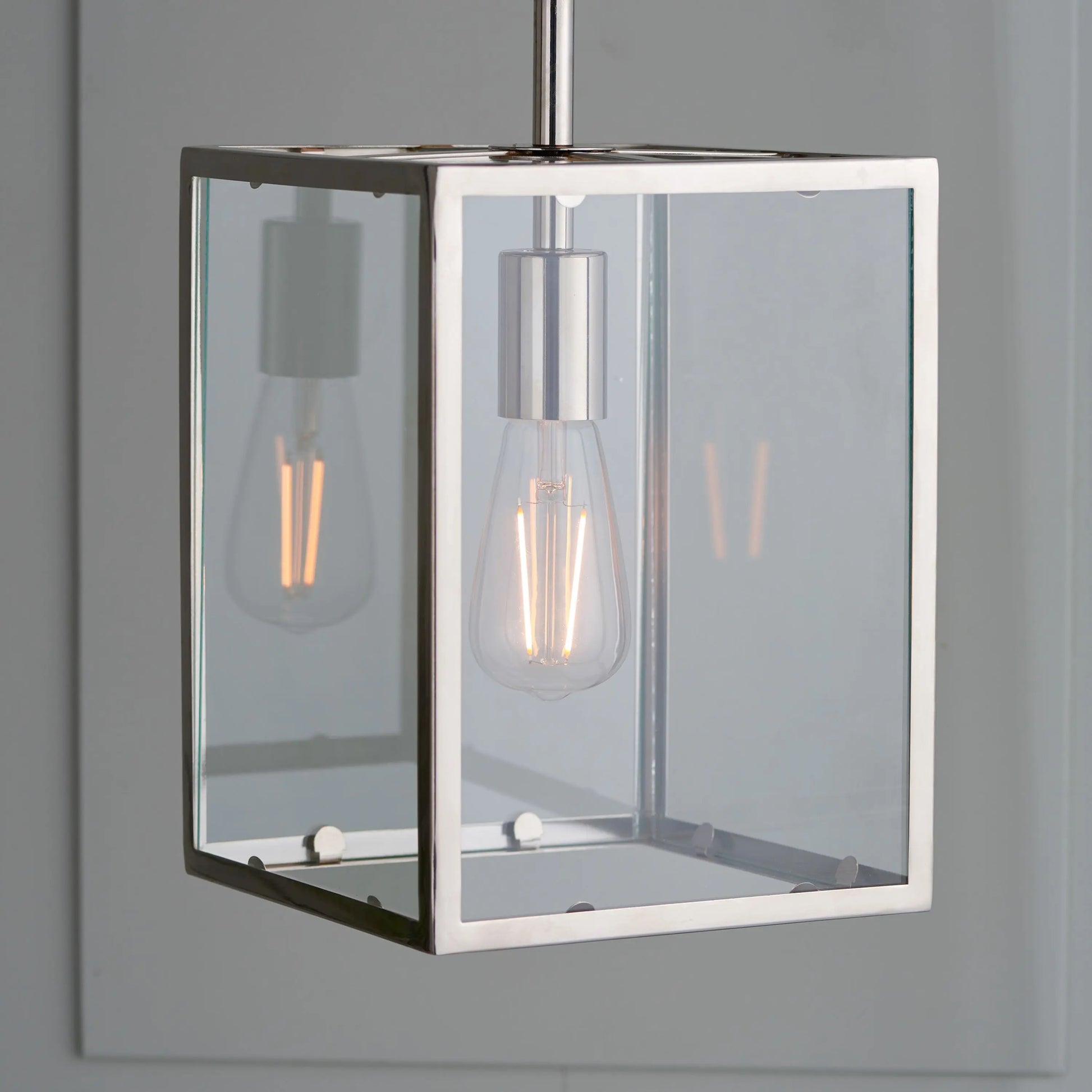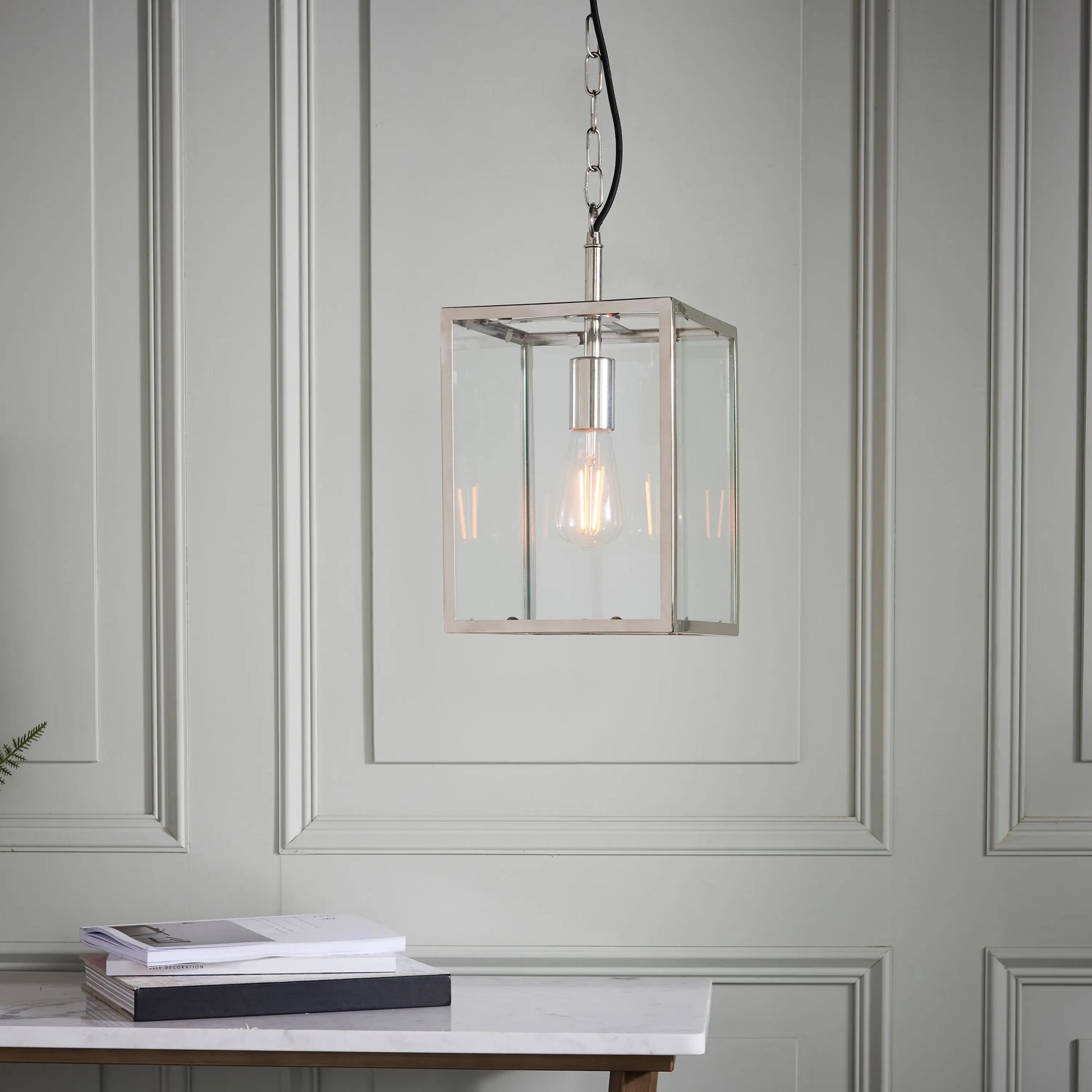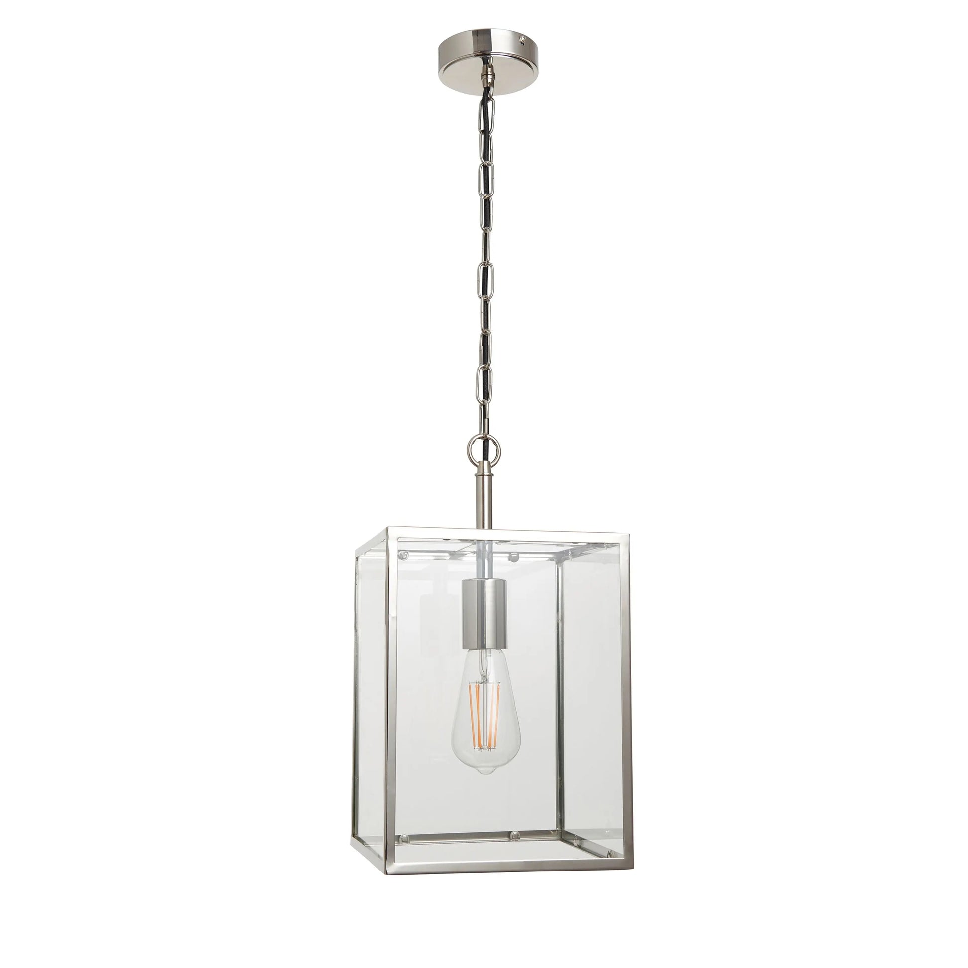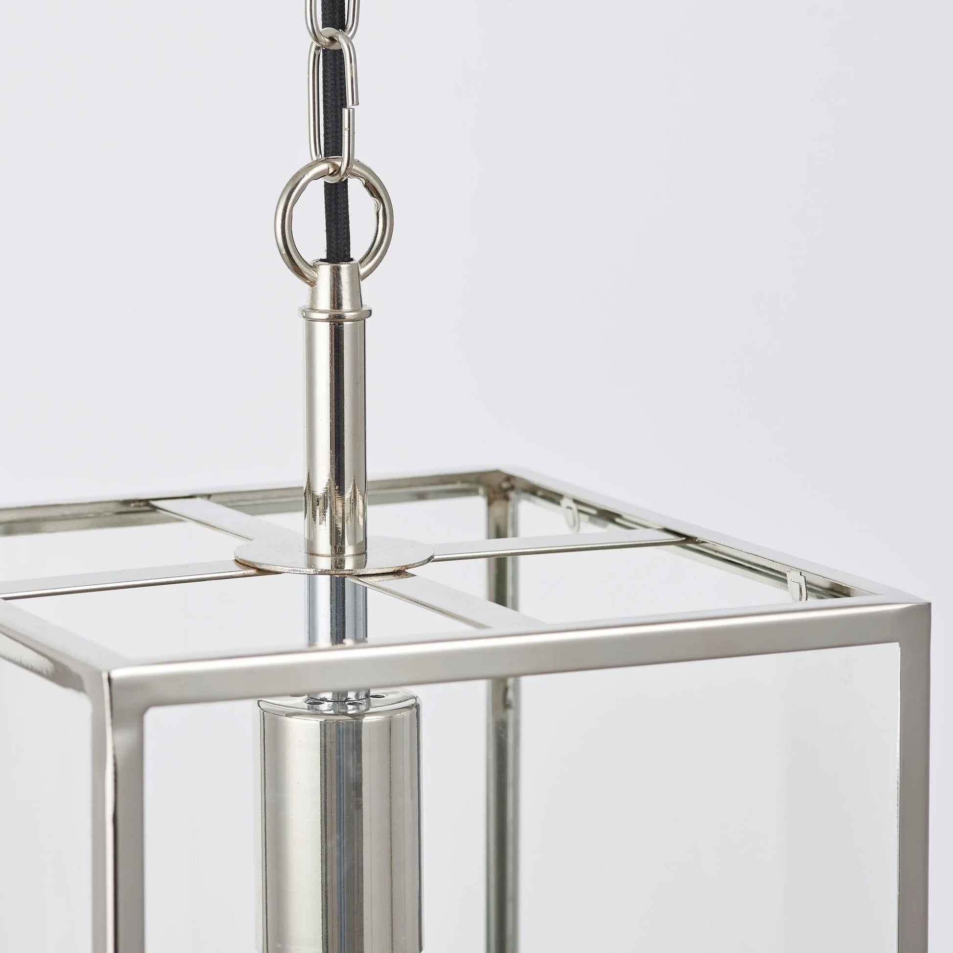 Authentic and timeless, inspired by box lanterns, the Hanley ceiling pendant is the perfect complement for today’s relaxed classic interiors. Finished in bright nickel and suspended from height adjustable chain with black fabric flex.