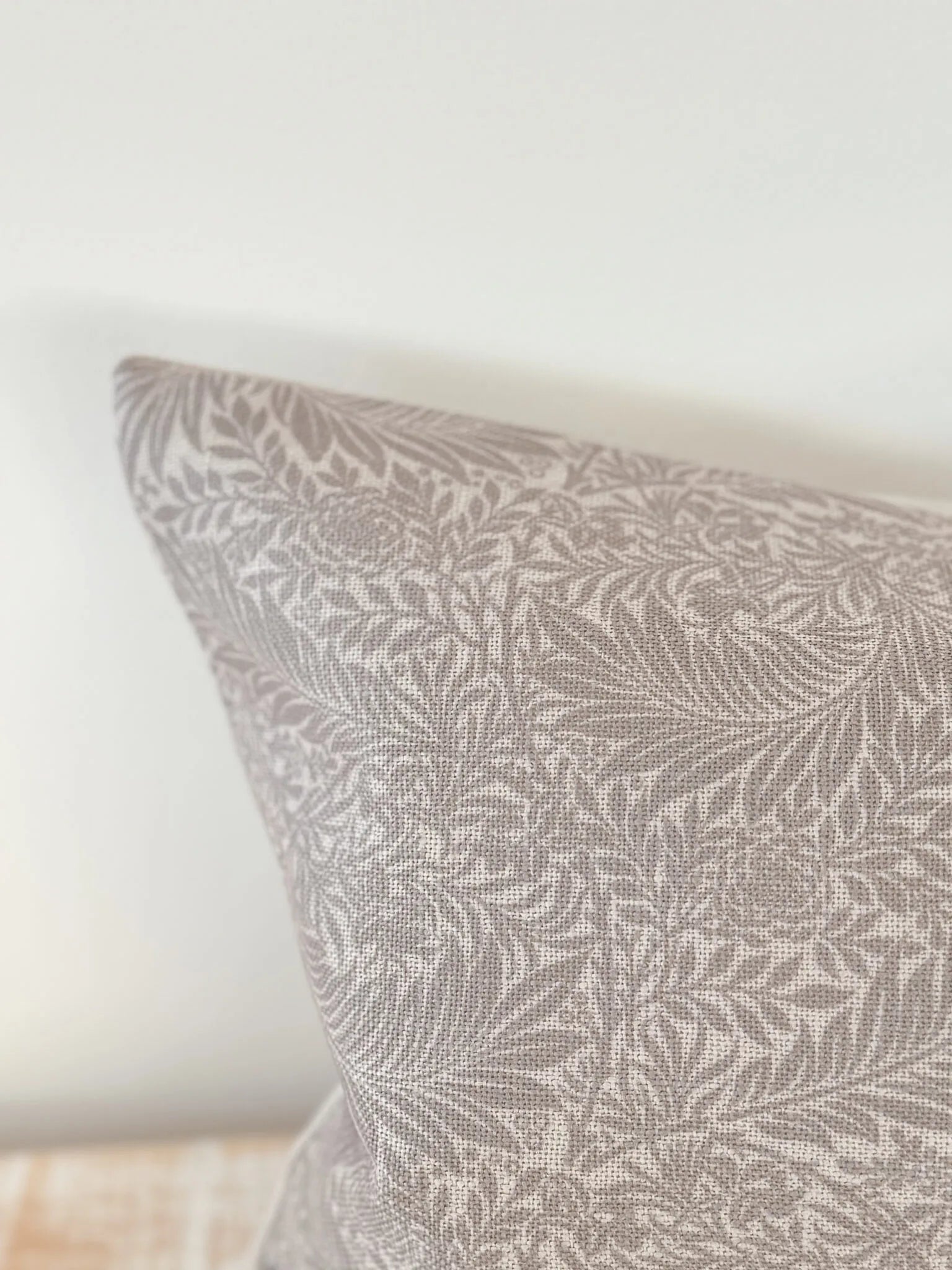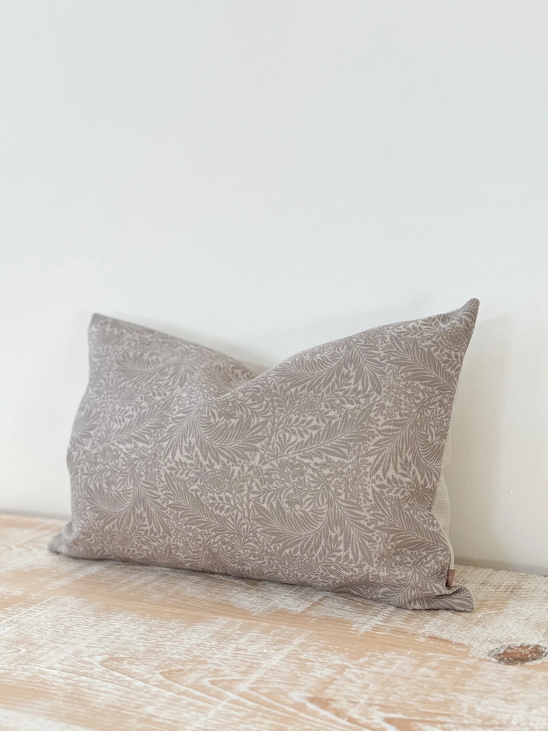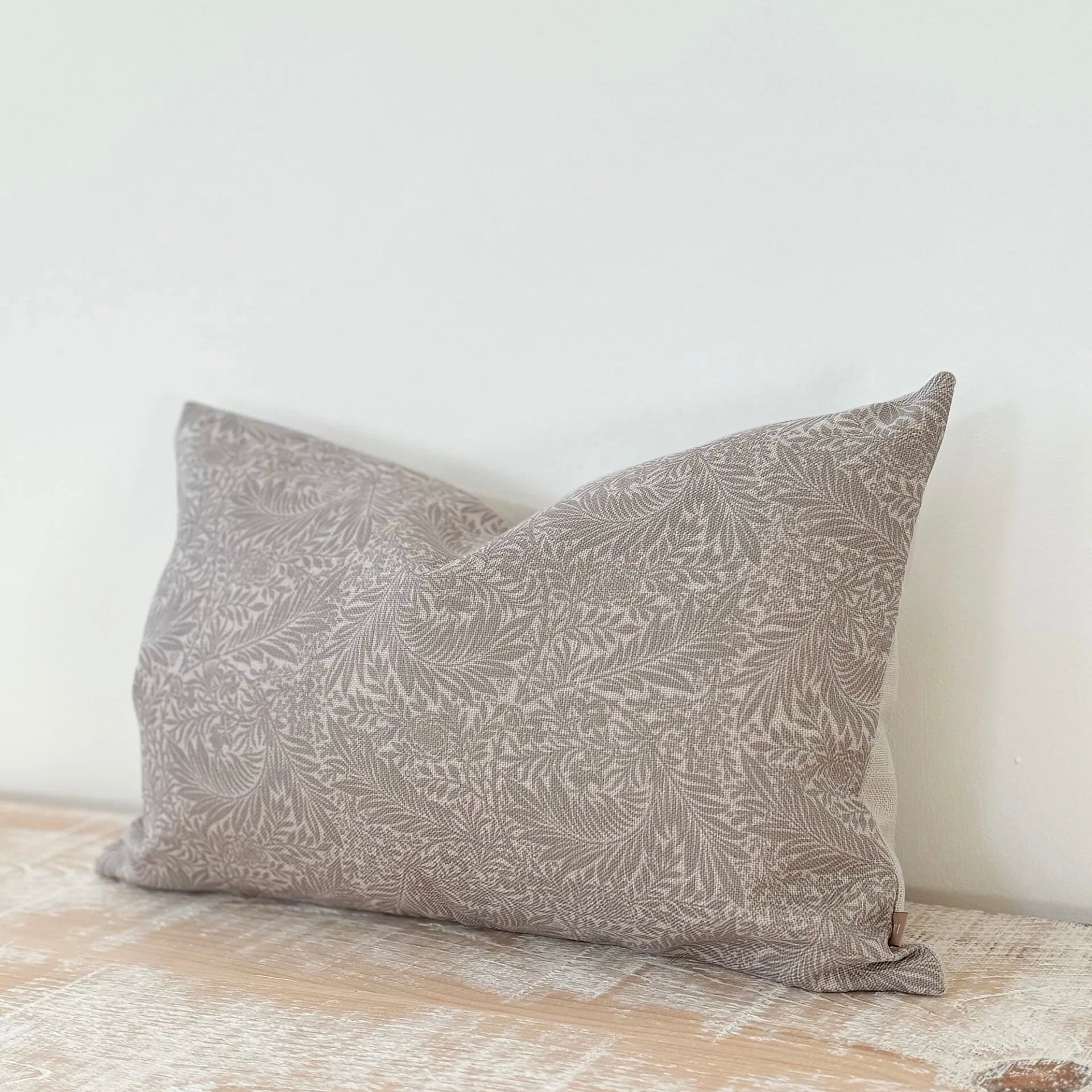 The Harriett cushion has a greige floral print on the front and an oatmeal back. It comes complete with a luxury feather insert.