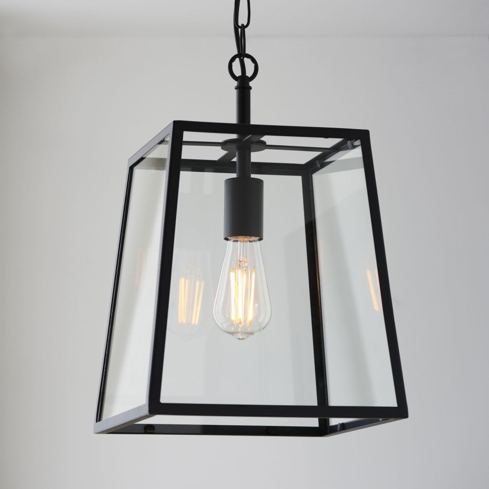 Inspired by box lanterns, the Hayes ceiling pendant is the perfect complement for today's relaxed classic interiors. Finished in matt black paint and suspended from height adjustable chain with black fabric flex. Pair with vintage style filament LED lamps that are perfectly framed by the subtle tapered metalwork and large clear glass panels.