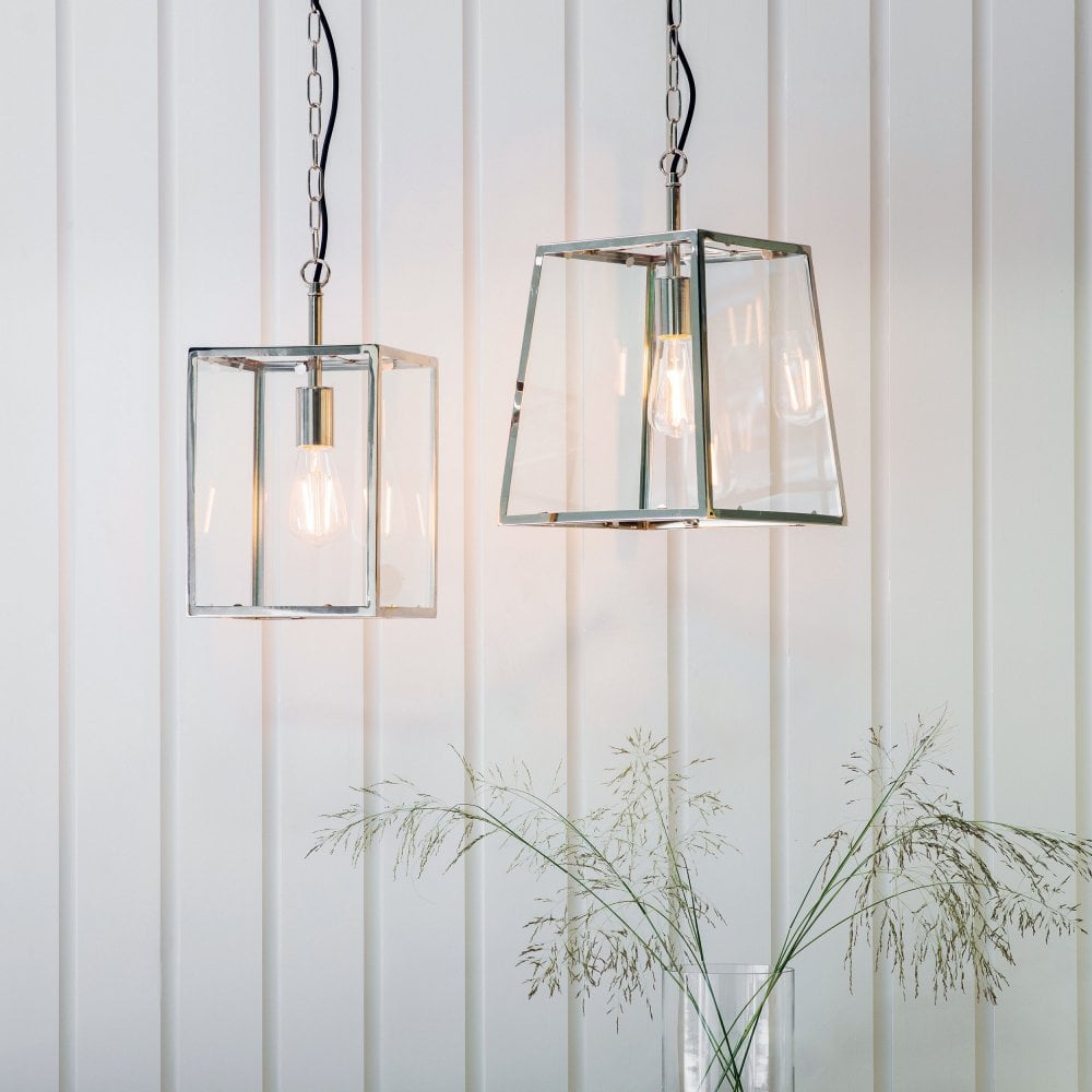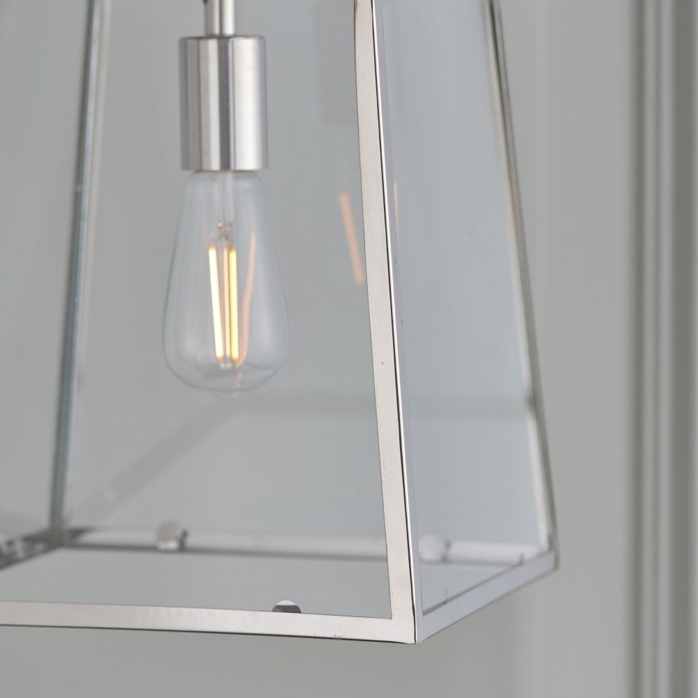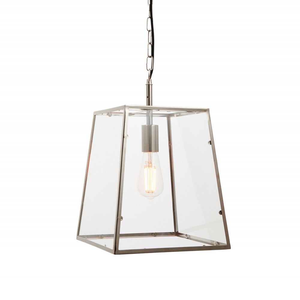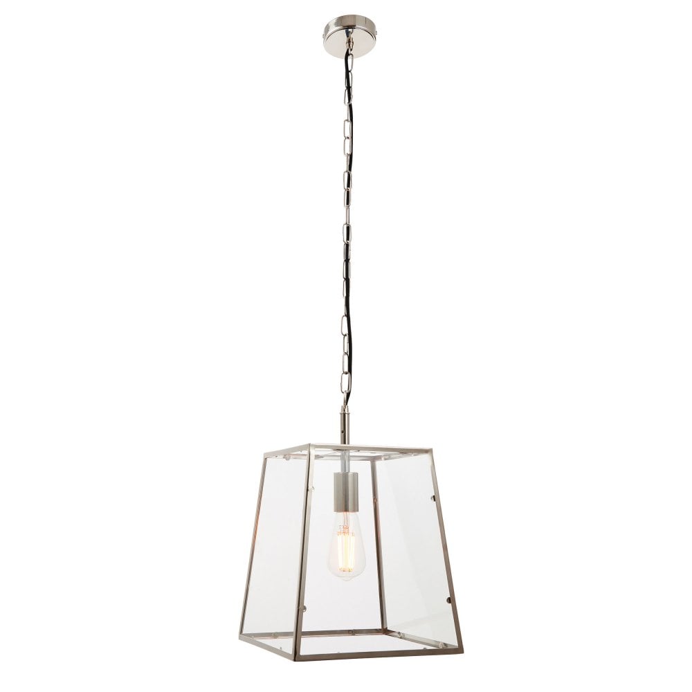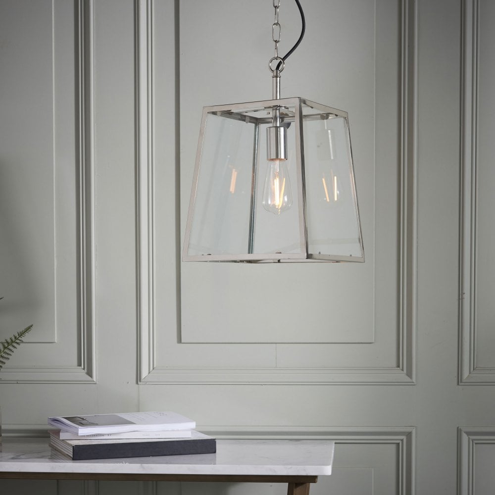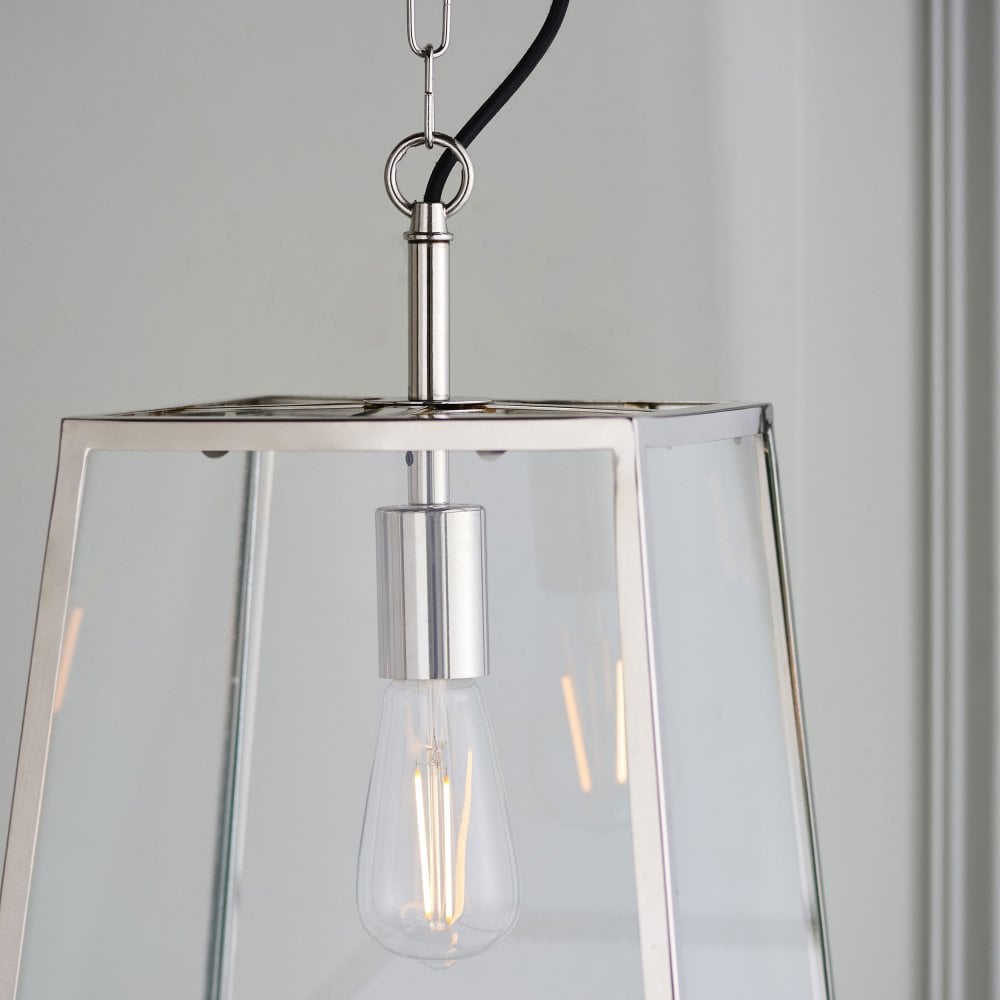 Inspired by box lanterns, the Hayes ceiling pendant is the perfect complement for today's relaxed classic interiors. Finished in bright nickel and suspended from height adjustable chain with black fabric flex. Pair with vintage style filament LED lamps that are perfectly framed by the subtle tapered metalwork and large clear glass panels.