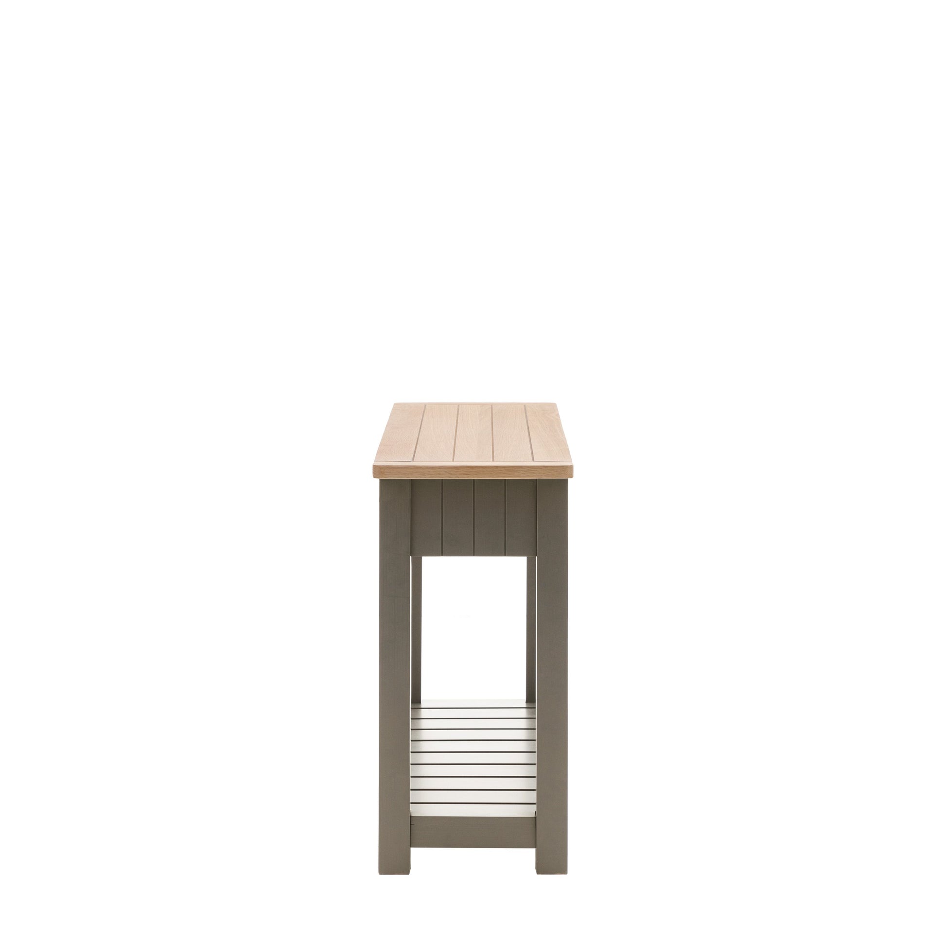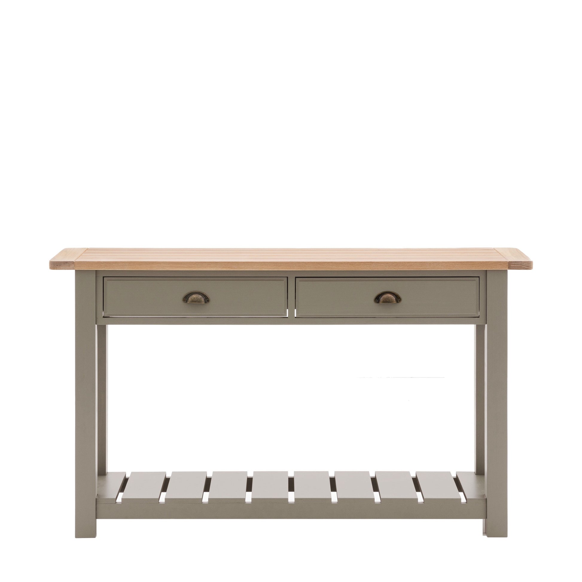 A modern update on a country classic, this console table is a versatile piece perfectly suited to both contemporary and rustic interiors. Featuring 2 drawers and a low shelf, the console table is perfect for living rooms, dining areas and kitchens alike, offering great additional storage. The hand painted subtly textured finish with metal drawer pulls and grooved & planked oak top add a modern twist to this country style console.