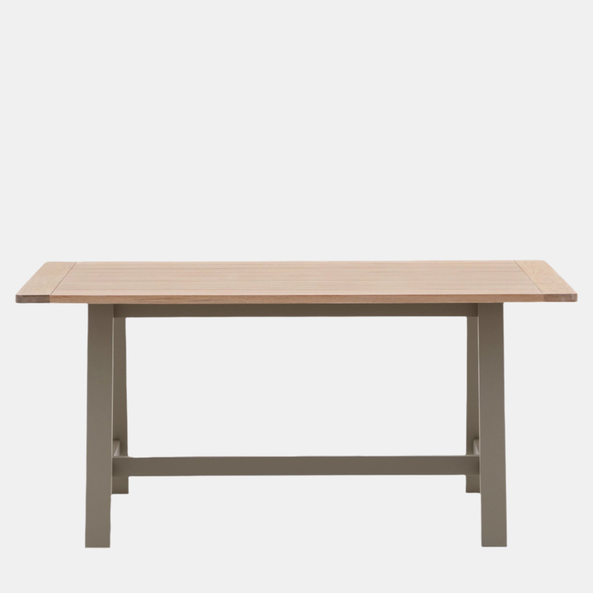 A modern take on a country style dining table, the Hedley rectangular trestle table features a grooved & planked oak top with the angular hand painted solid timber legs. Pairs perfectly with the coordinating bench or dining chairs.