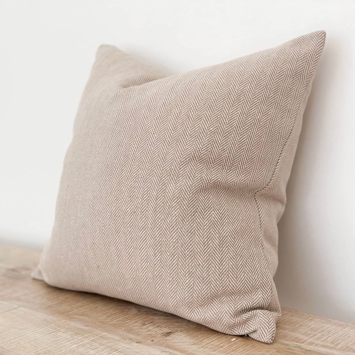 The Herringbone Cushion Cover is beige with a herringbone pattern.