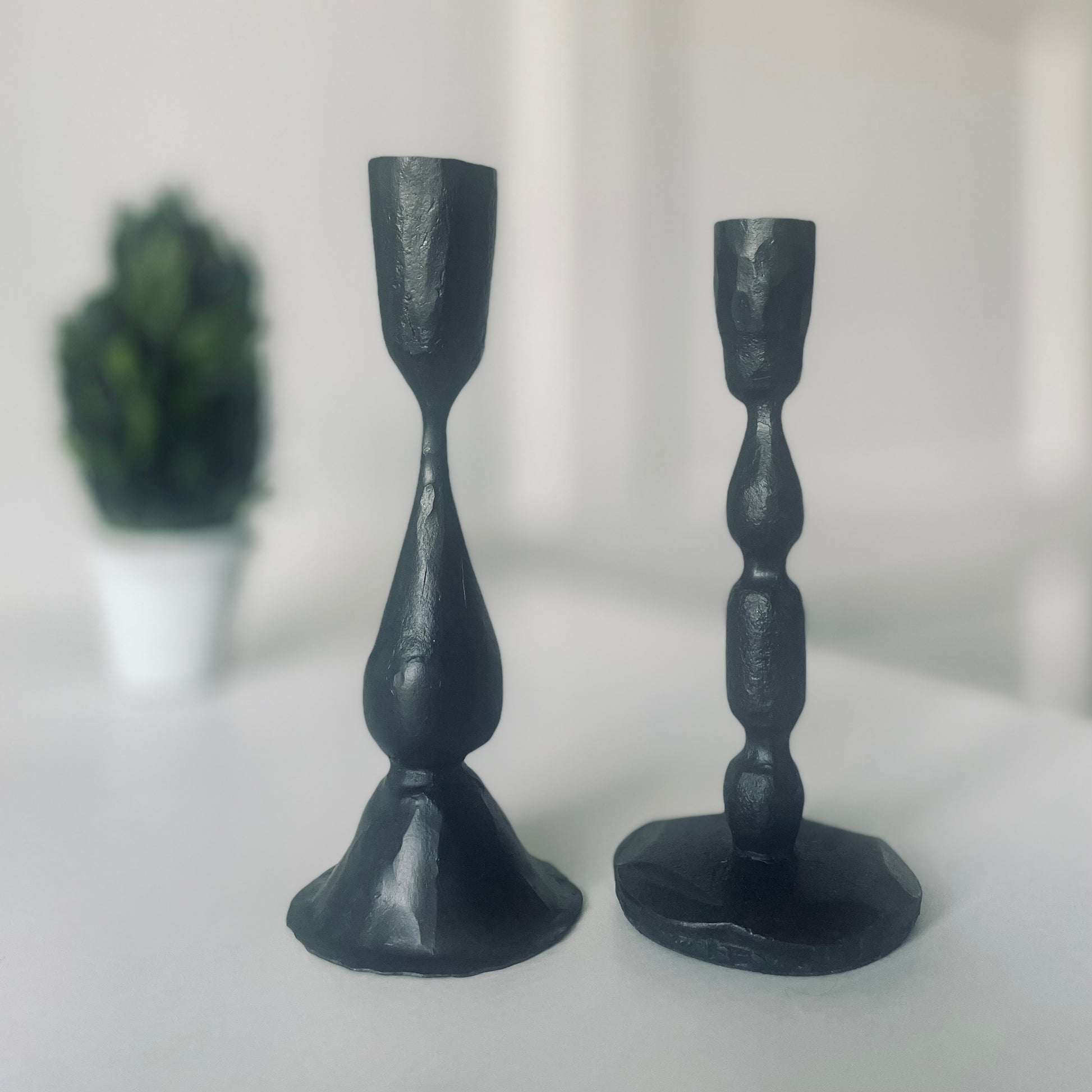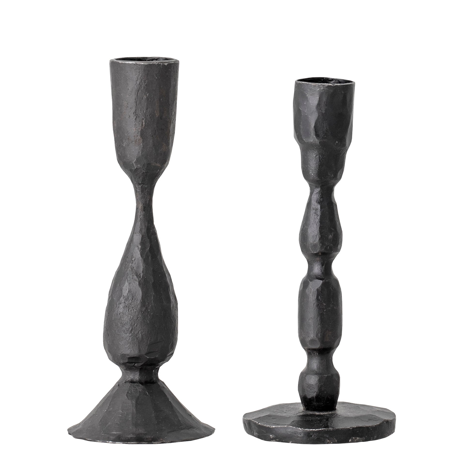 A set of two candlesticks in black hammered metal.