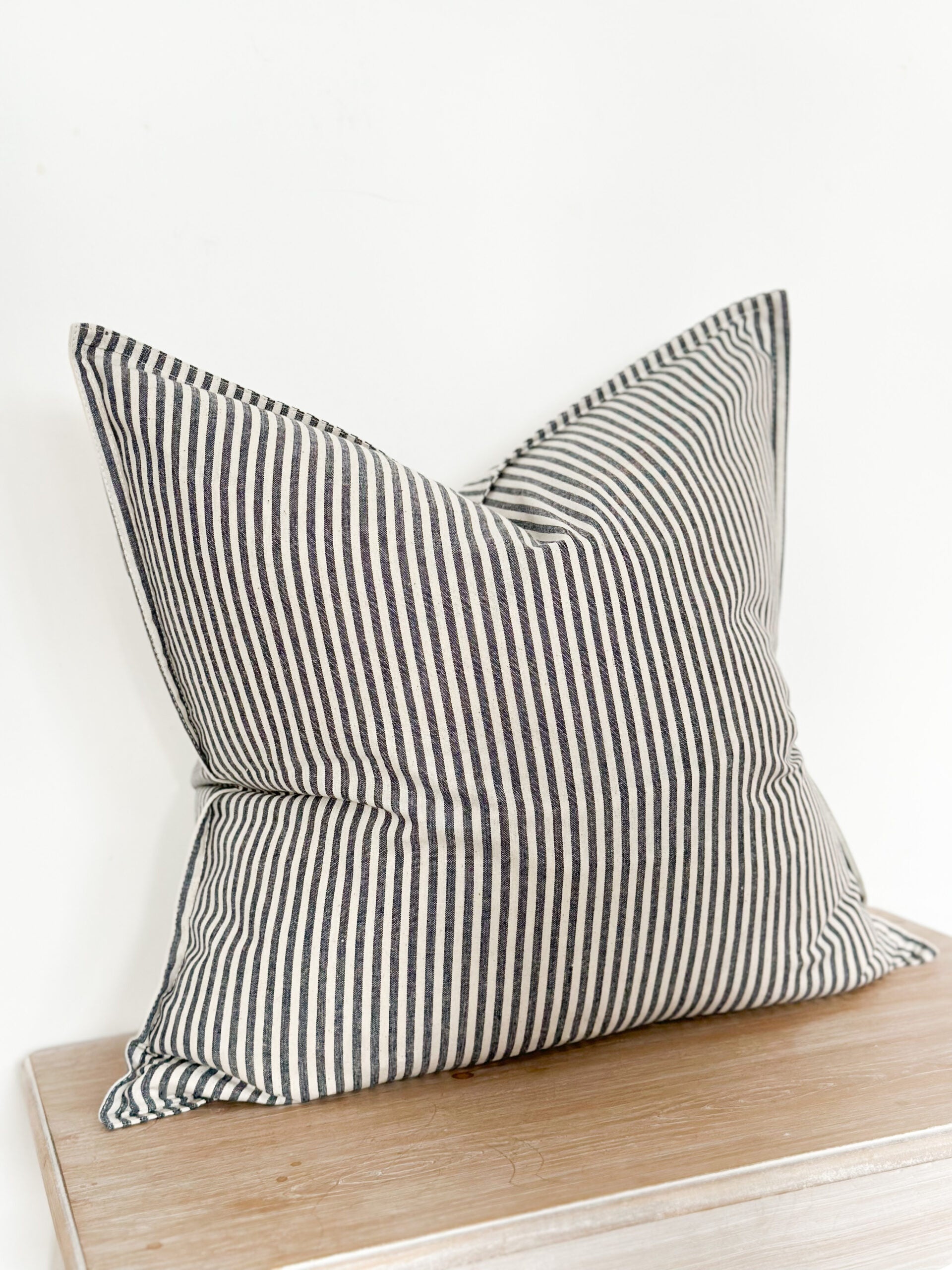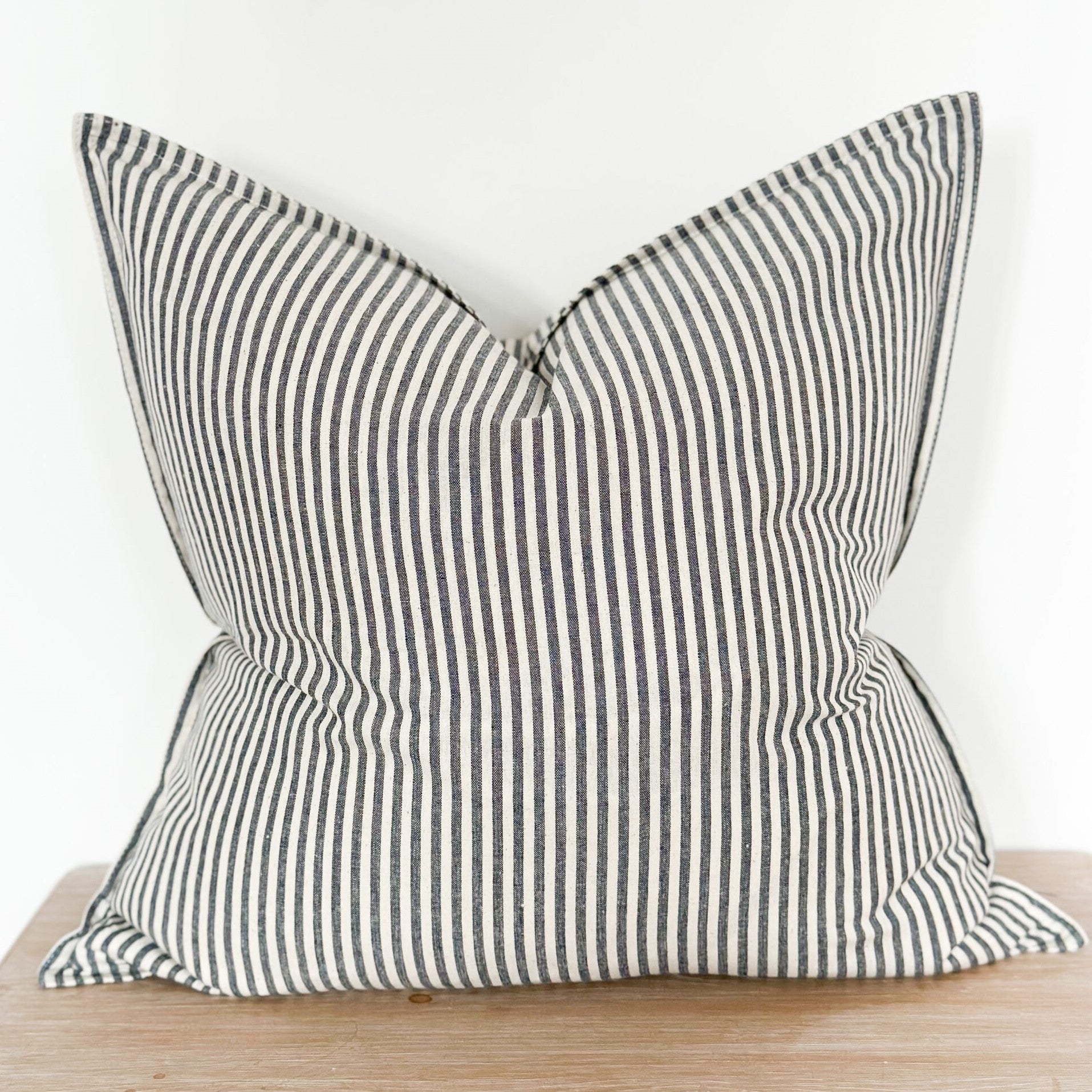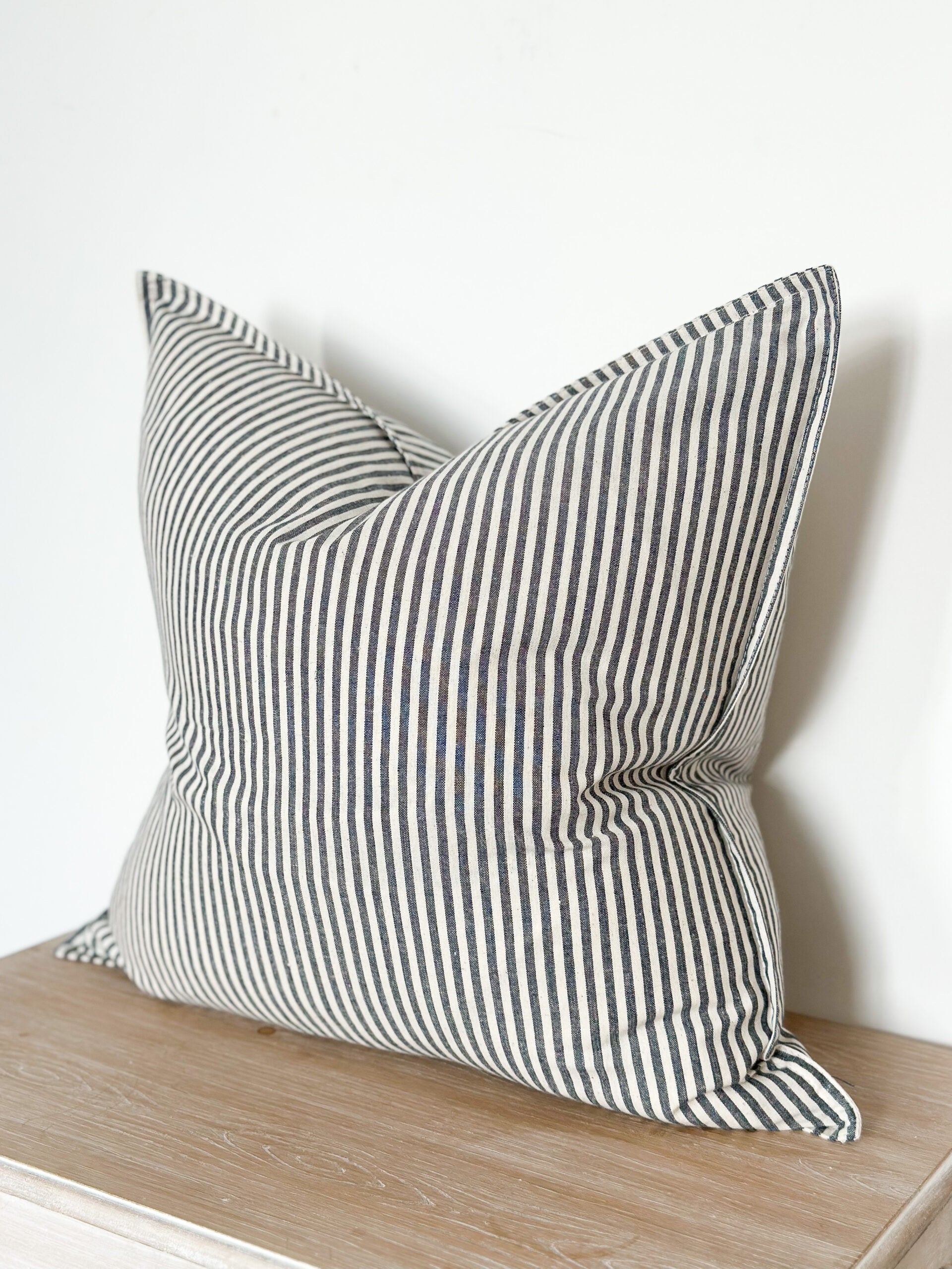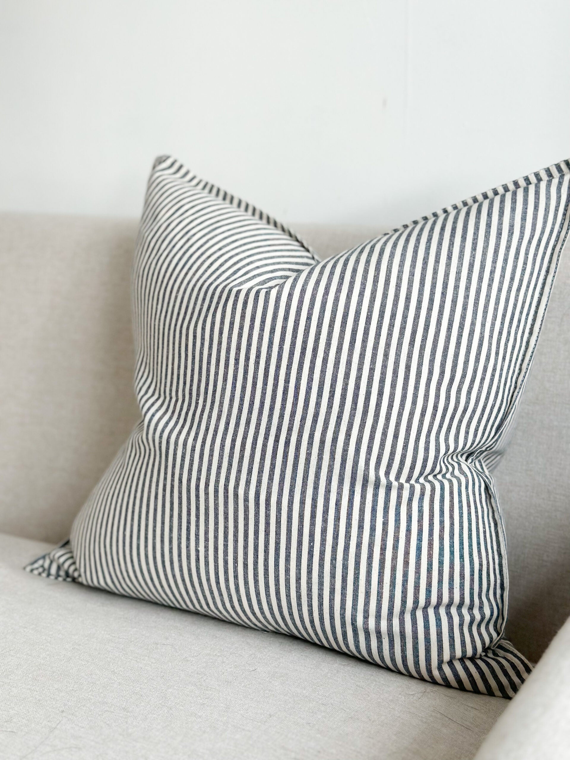 The Jessica Cushion Cover has a cream coloured cotton background with a thin navy stripe.