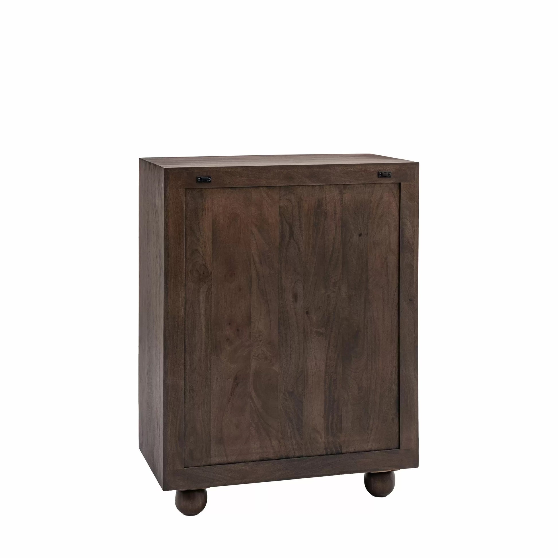Bring 70s fashion into the present day with this twist on classic retro style. Featuring relief arch patterns and rounded ball feet this 2 door cupboard makes a bold style statement while also being a great storage solution. Made from Mango wood stained to a lovely dark tone to highlight the woods rich grains.