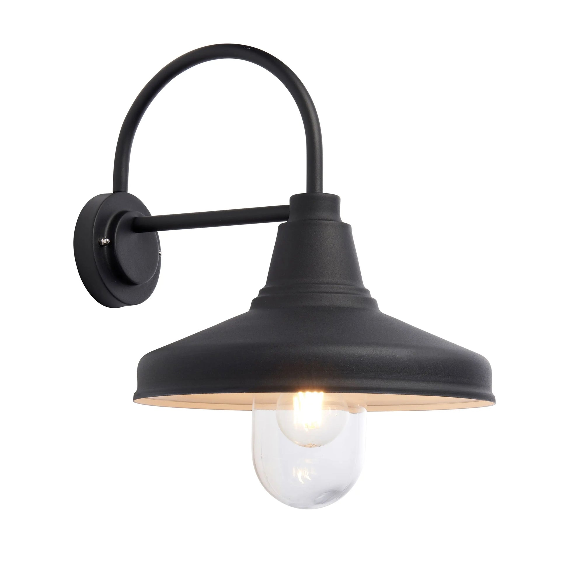 Modern traditional exterior wall light with textured black finish metalwork. Perfect for use with E27 LED filament lamps. IP44 rated for safe exterior use.