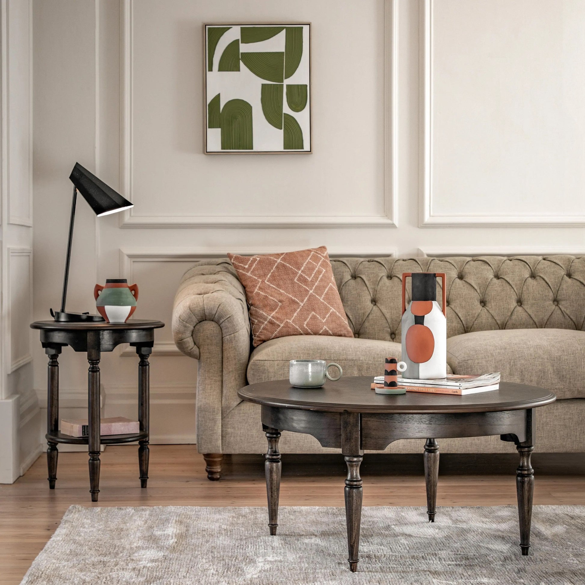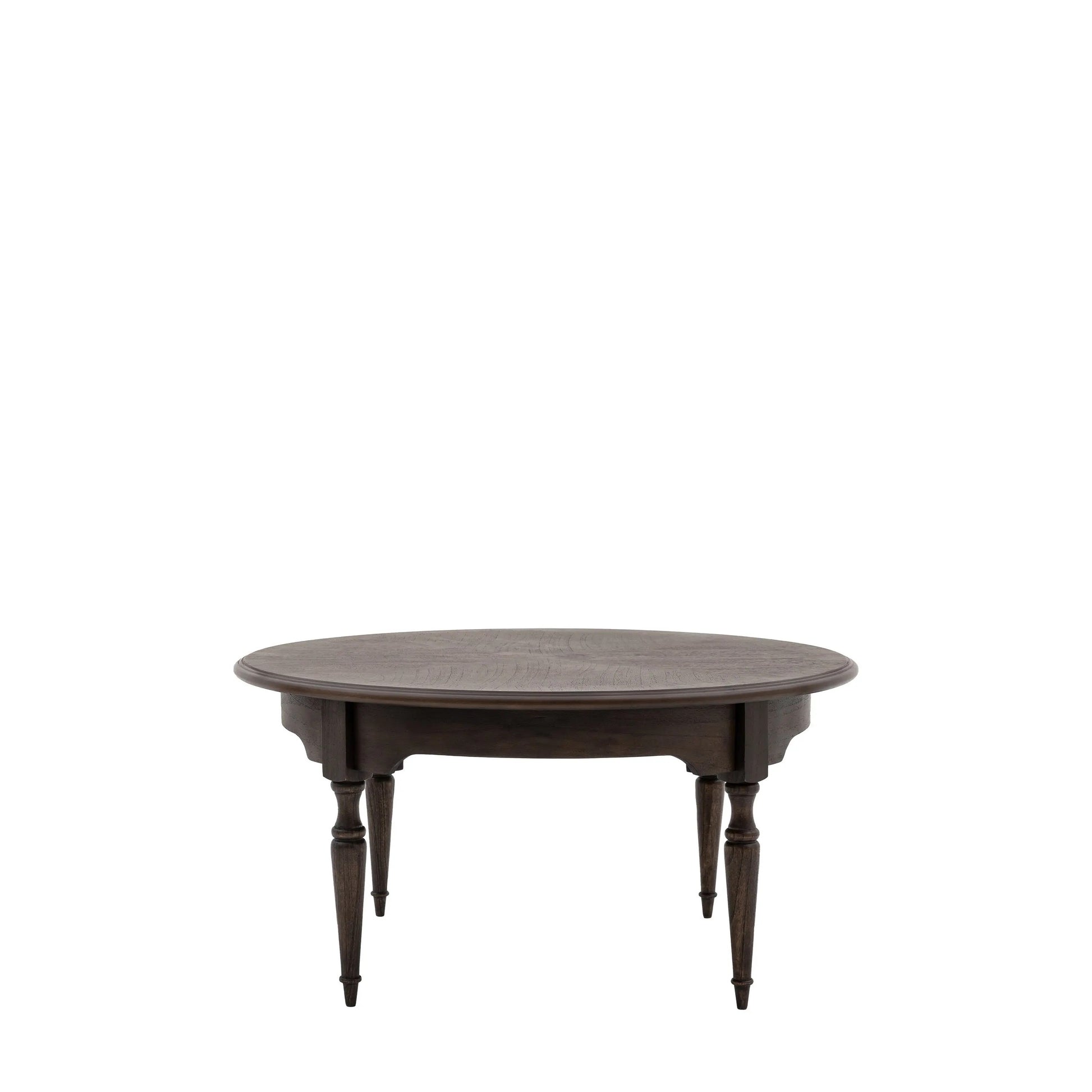 Offering a 'new traditional' look, with its timeless, elegant style and a modern touch, this stunning coffee table features exquisite dark salvaged coffee colour finished Mindy wood solids & veneers, with elegant inlaid marquetry details adding a final elegant touch.