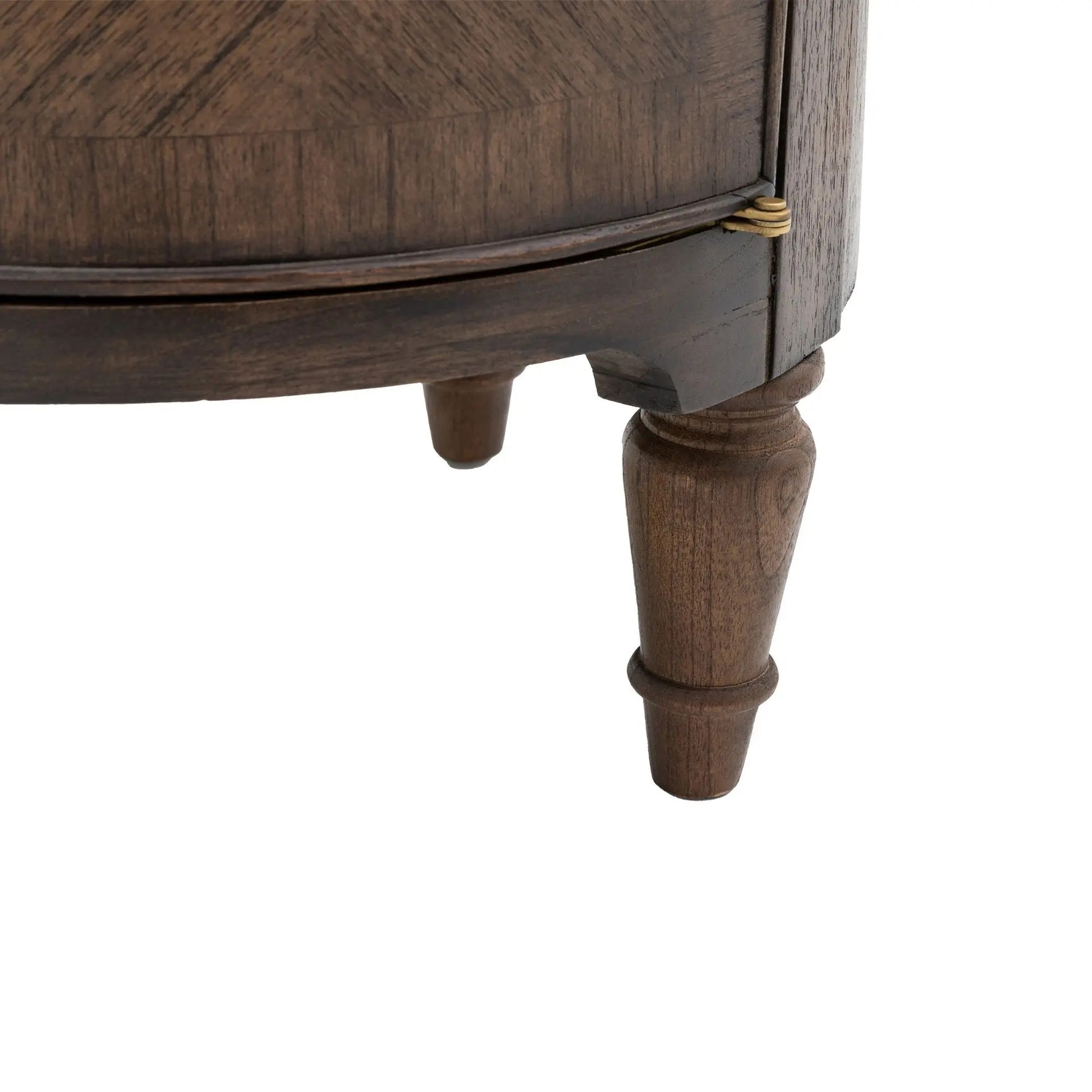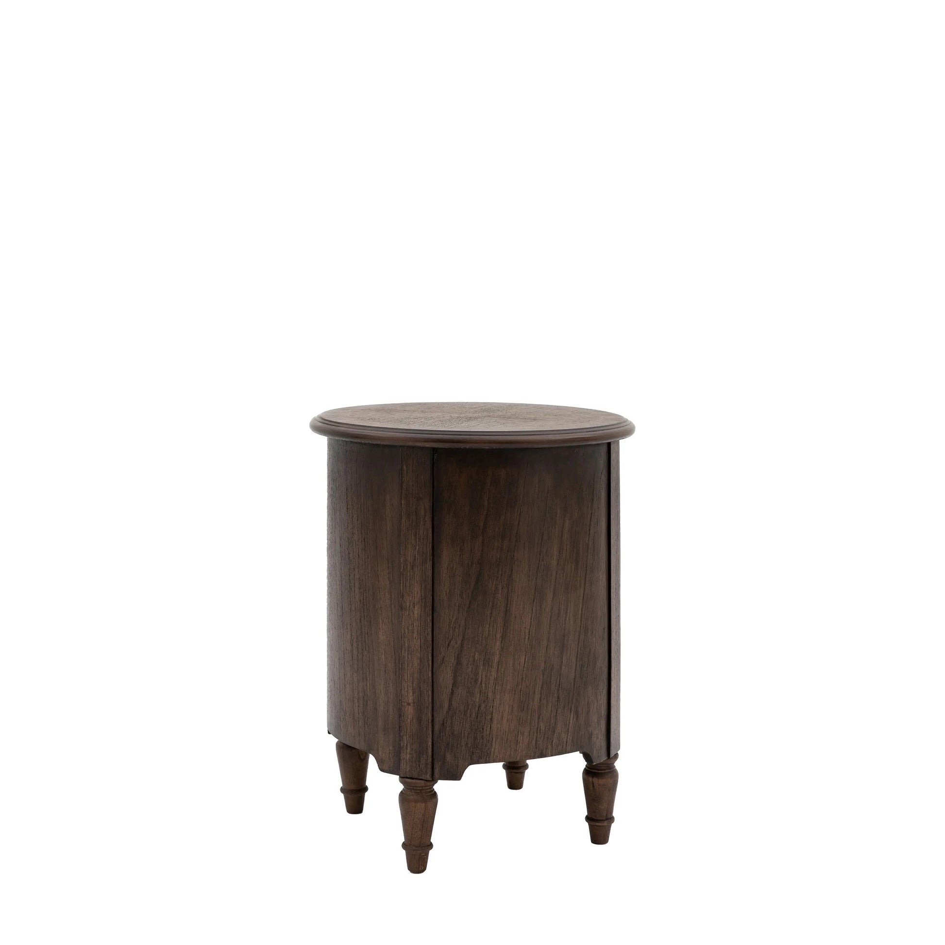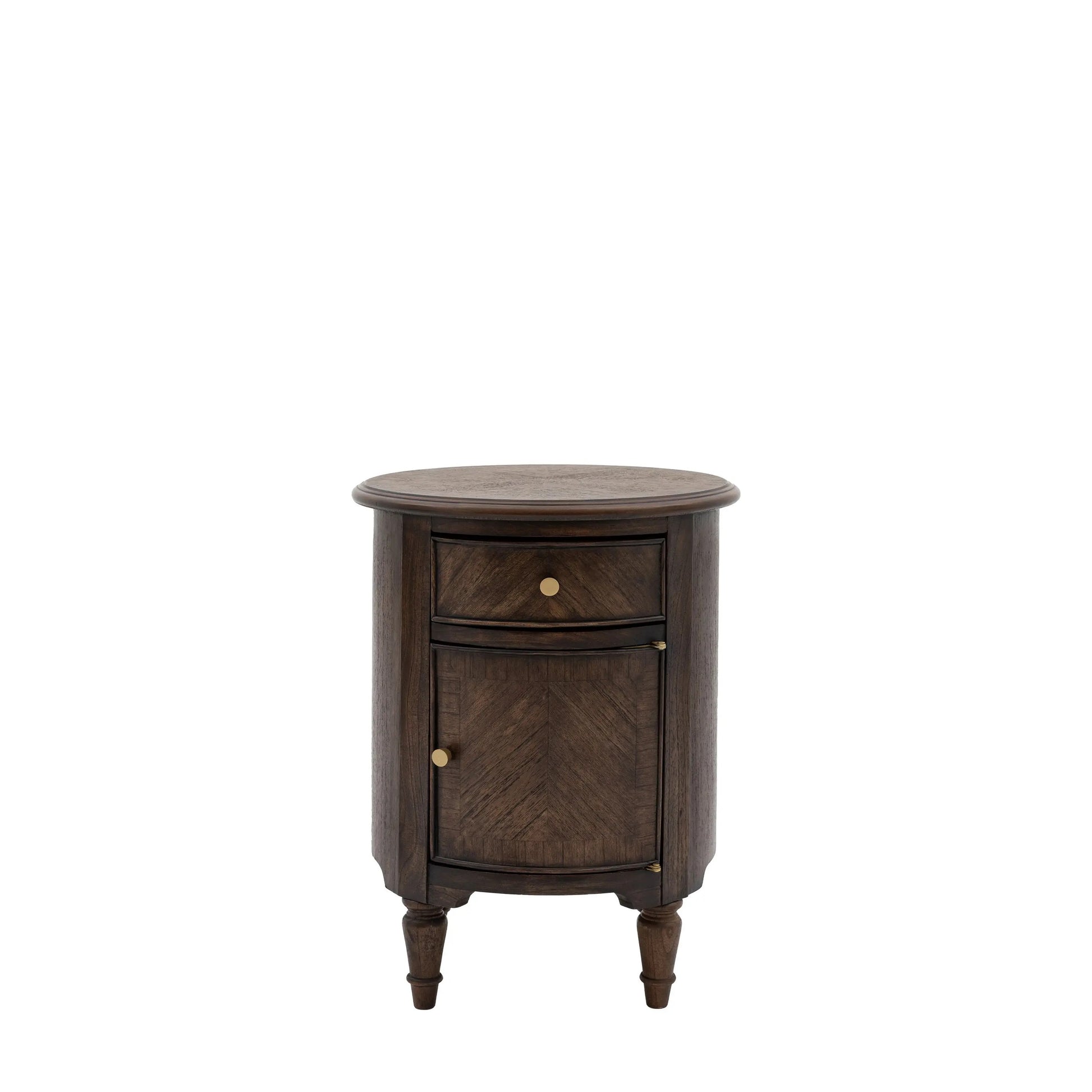 Offering a 'new traditional' look with a timeless elegant style and a modern touch. In dark salvaged coffee coloured Mindy wood solids & veneers and featuring marquetry details this drum side table is elegantly sophisticated. The satin brass handles and turned spindle feet add the finishing touch. A small drawer and cupboard make this side table a stylish storage solution, perfect for the bedroom or living spaces alike.