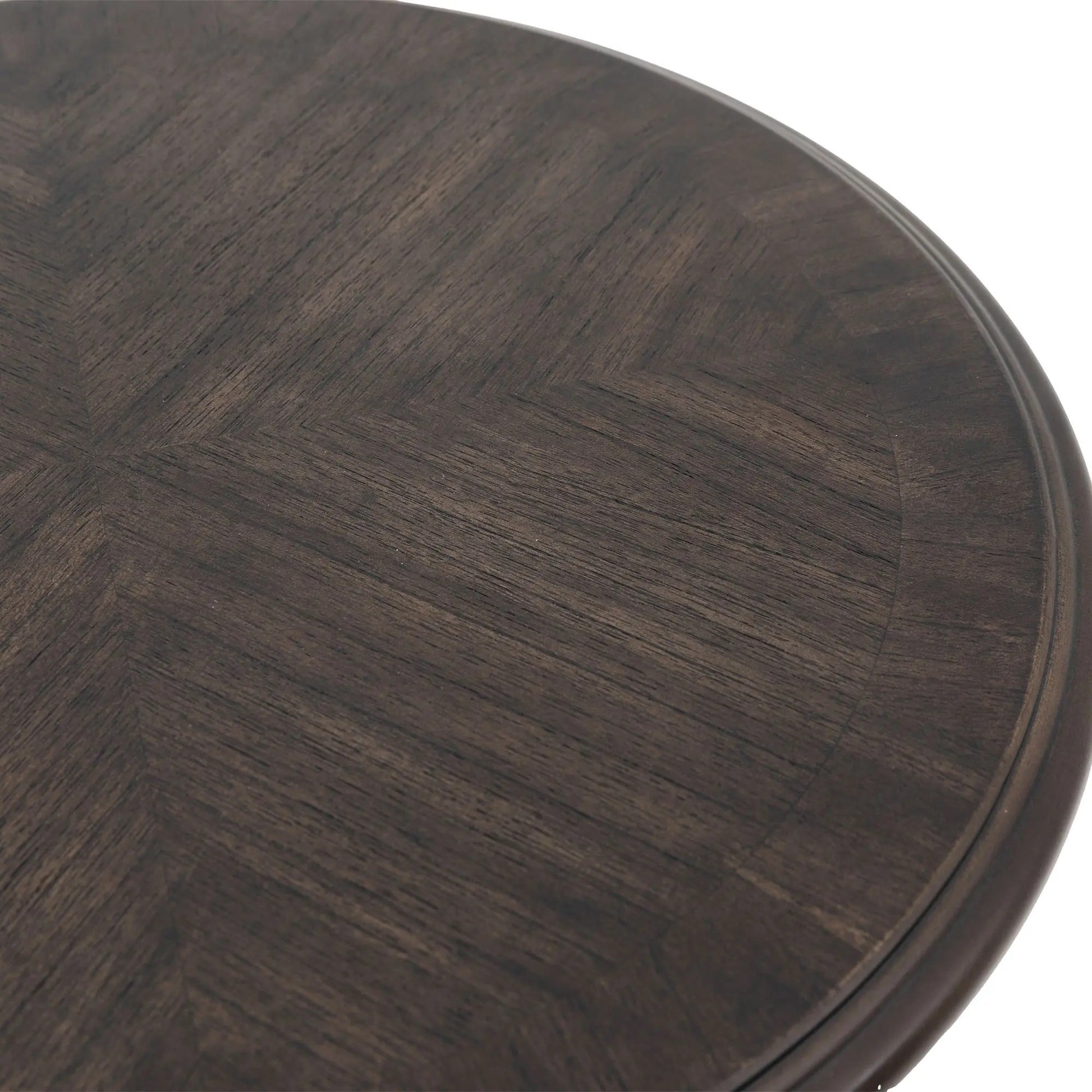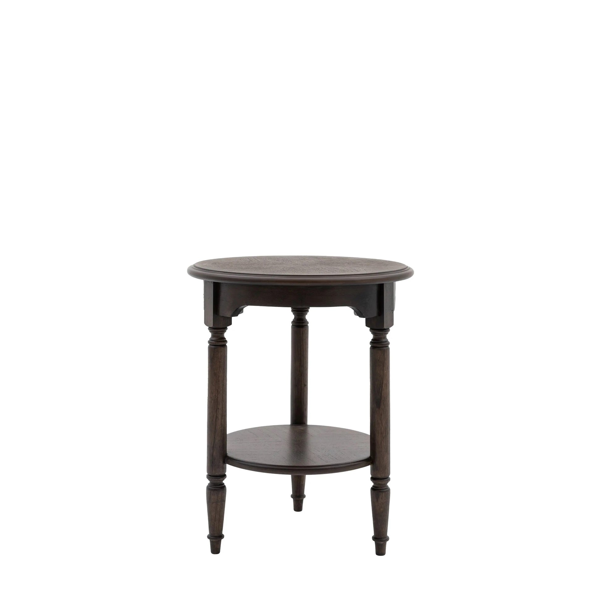 Offering a 'new traditional' look, with a timeless, elegant style and modern touch, this stunning side table features exquisite dark salvaged coffee coloured Mindy wood solids & veneers. The book matched marquetry detail and turned spindle legs create a stunningly elegant side table.