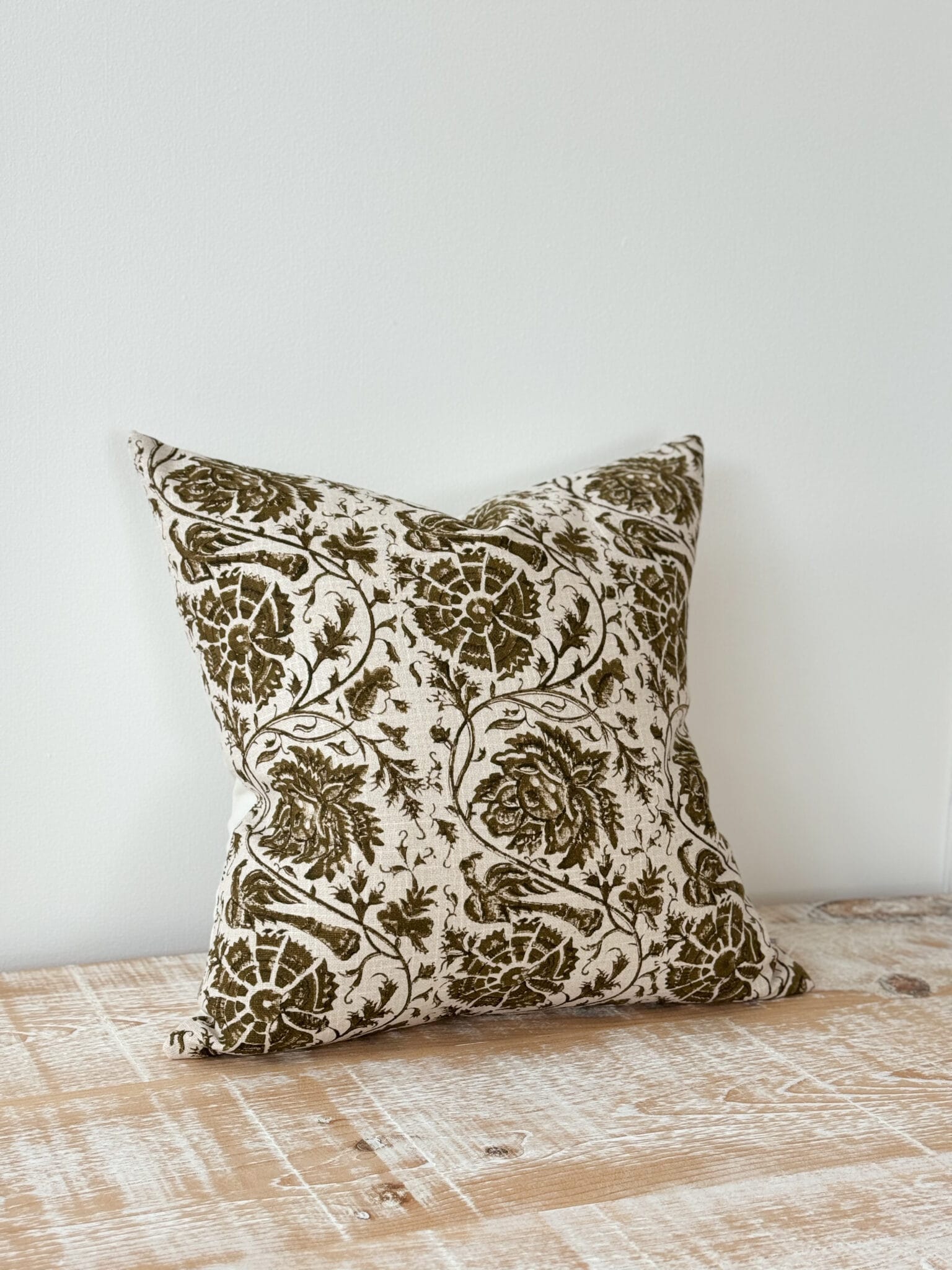 The Mae cushion cover is made from high quality cotton and features a rustic olive floral print on the front and a plain oatmeal coloured back.