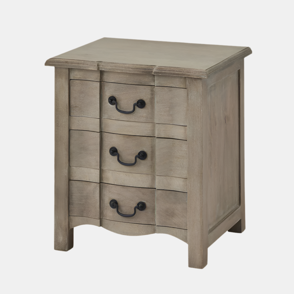 Evoking a classic style with elegant hard wood, the Maine collection offers all the elegance of French style furniture combined with contemporary touches. This stylish 3 drawer bedside boasts useful storage space within an elegant, handcrafted hard wood exterior.