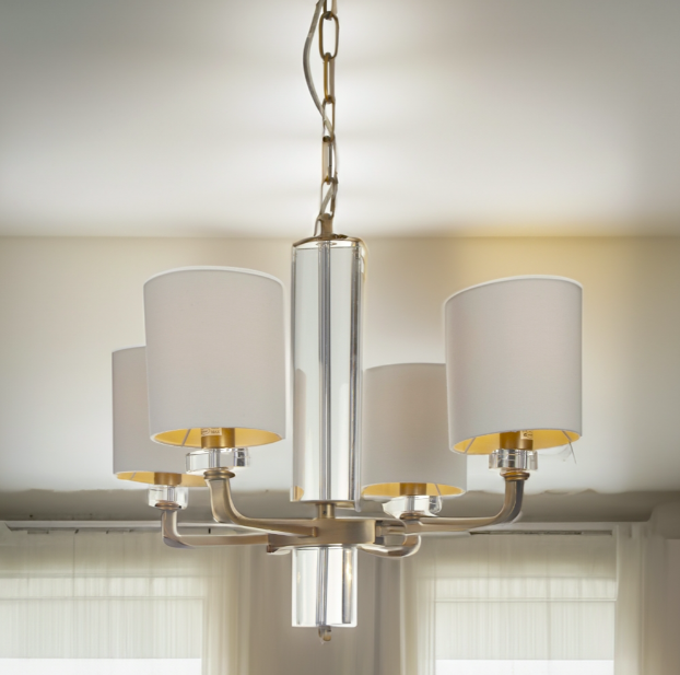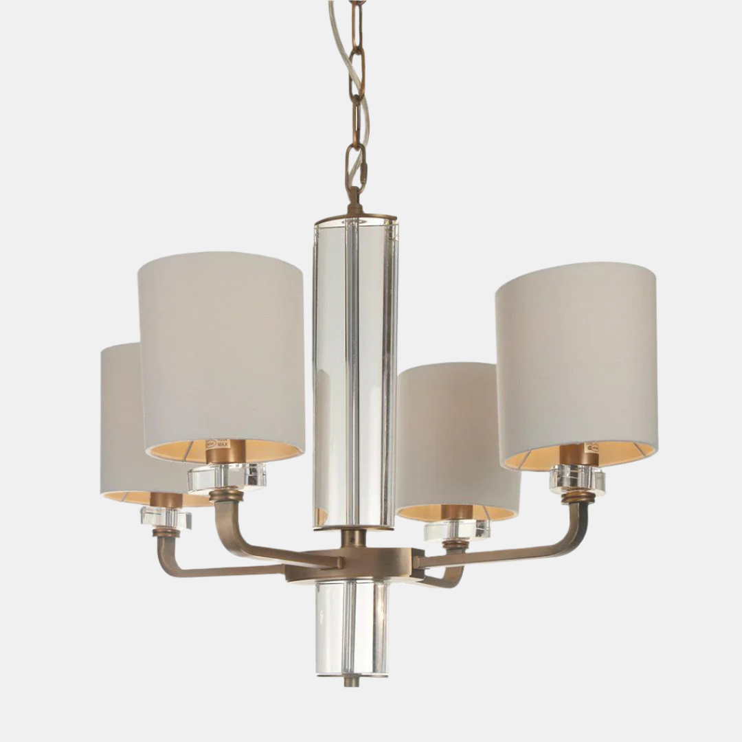 Finished in antique brass with cognac crystal, the timeless Marcia Chandelier will add a little glamour to your space.