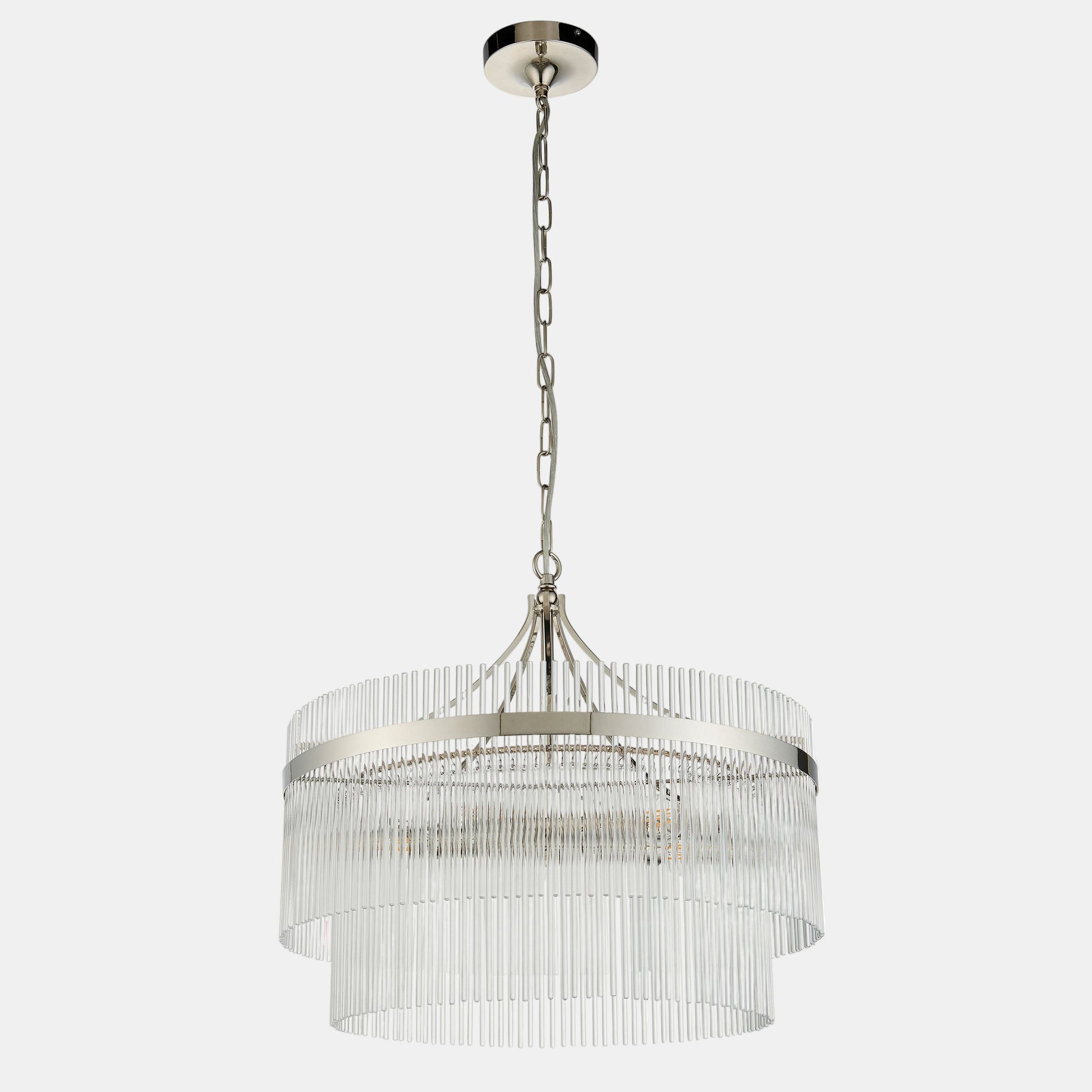 Beautiful contemporary interpretation of the chandelier in polished nickel plated finish. Decorative clear glass rods diffuse the light to create an inviting ambience. The chain can be adjusted to suit ceiling height and allow it to be perfectly hung above dining tables or in living spaces.