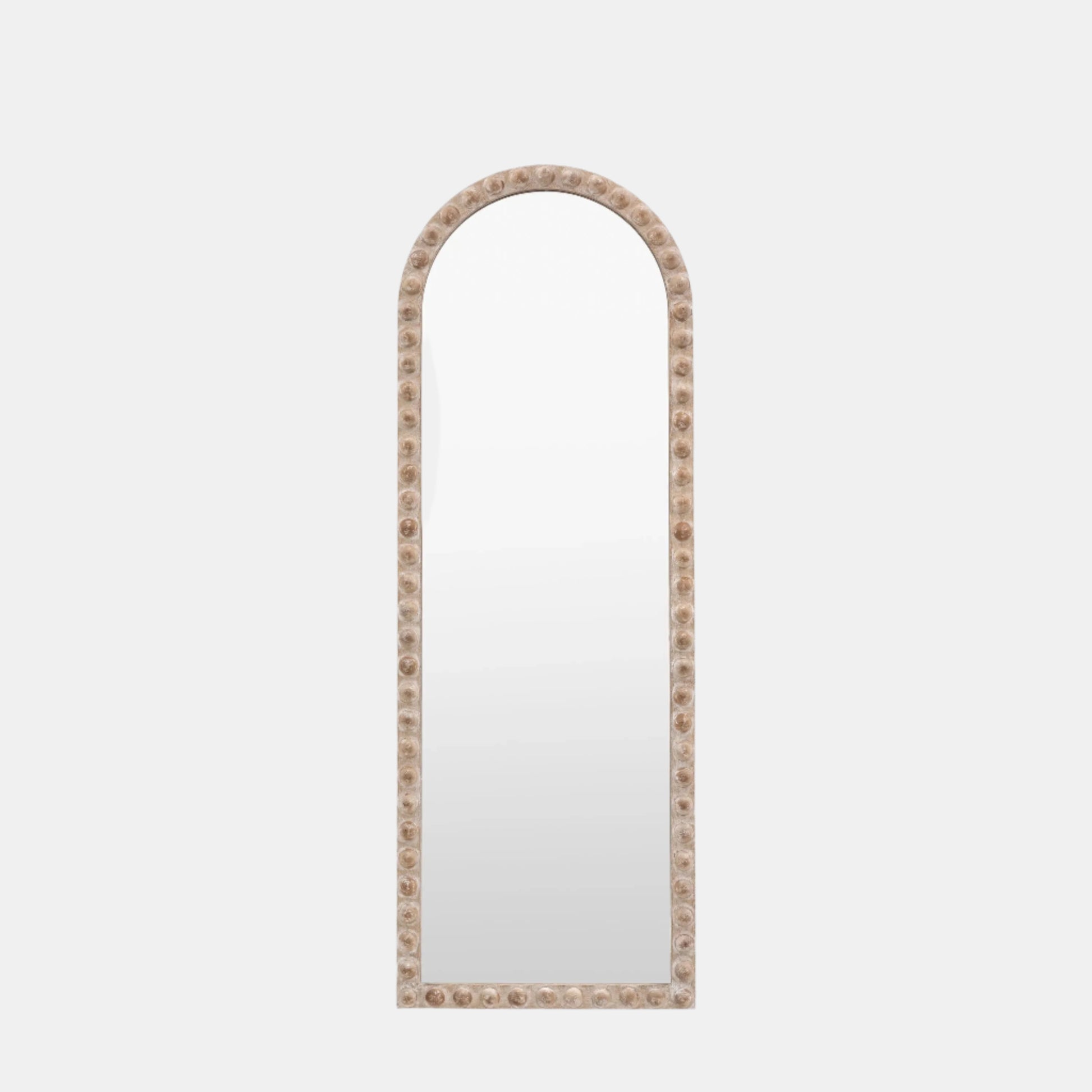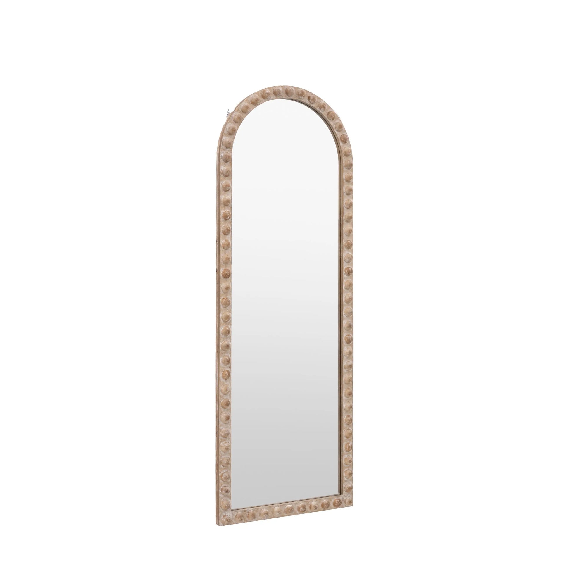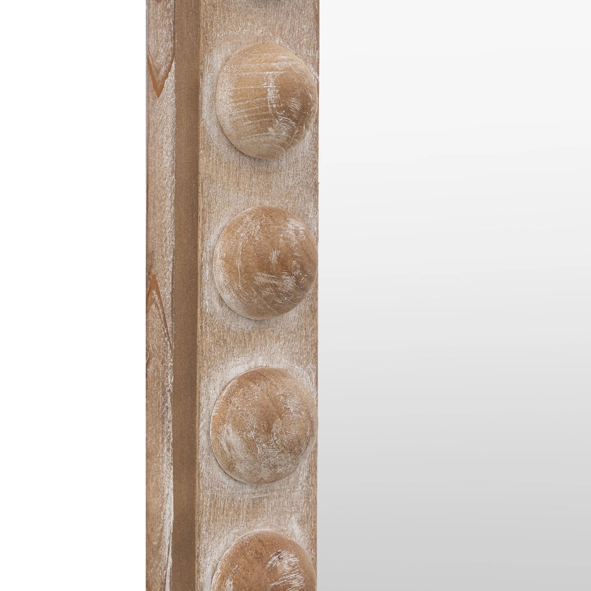 Bring rustic contemporary elegance to your home with the Milton wooden leaner mirror, featuring a gracefully arching top and 3D wooden bobble detail. The classic arch design adds a touch of architectural sophistication, while the intricately crafted bobbles provide a delightful, textured detail. The warm wood finish complements various decor styles, making this mirror a versatile addition to your living room, bedroom, or hallway. Leaned against a wall or used as a striking focal point, it not only reflects your space but also infuses it with classic, refined charm.