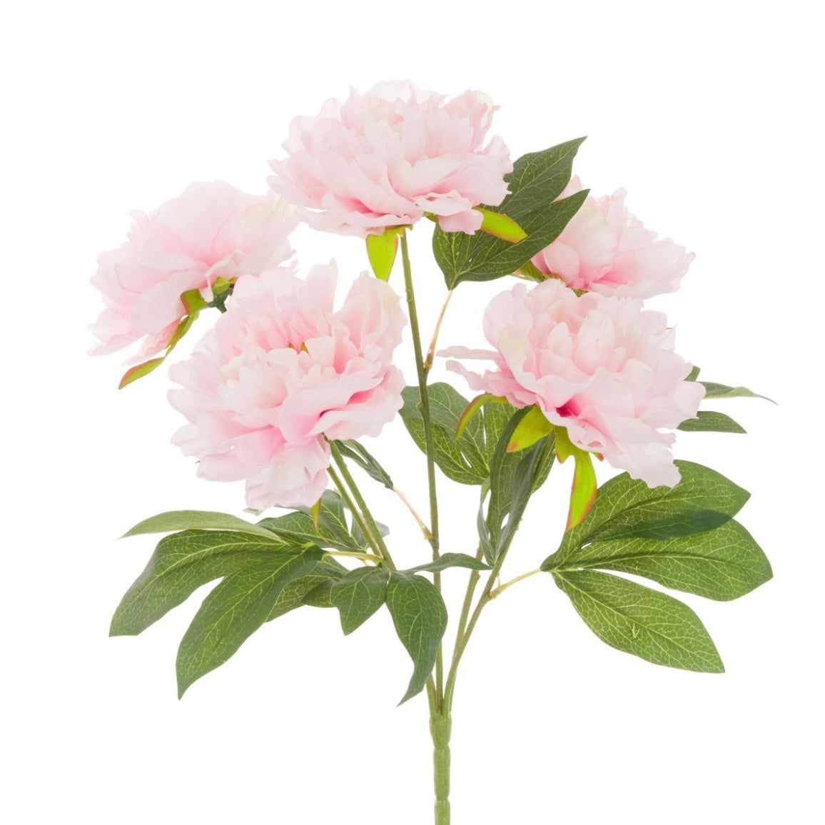 This beautiful, lifelike artificial peony bunch features 5 pink flower heads and large green leaves.