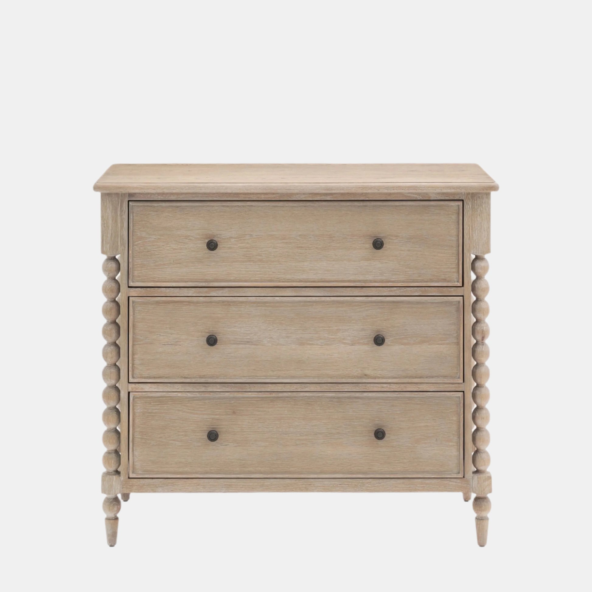 The Quincy 3 Drawer Chest features hand-turned bobbin detailing and a lime-wash oak finish, blending durability and sophistication. The three spacious drawers are ideal for organising with ease.