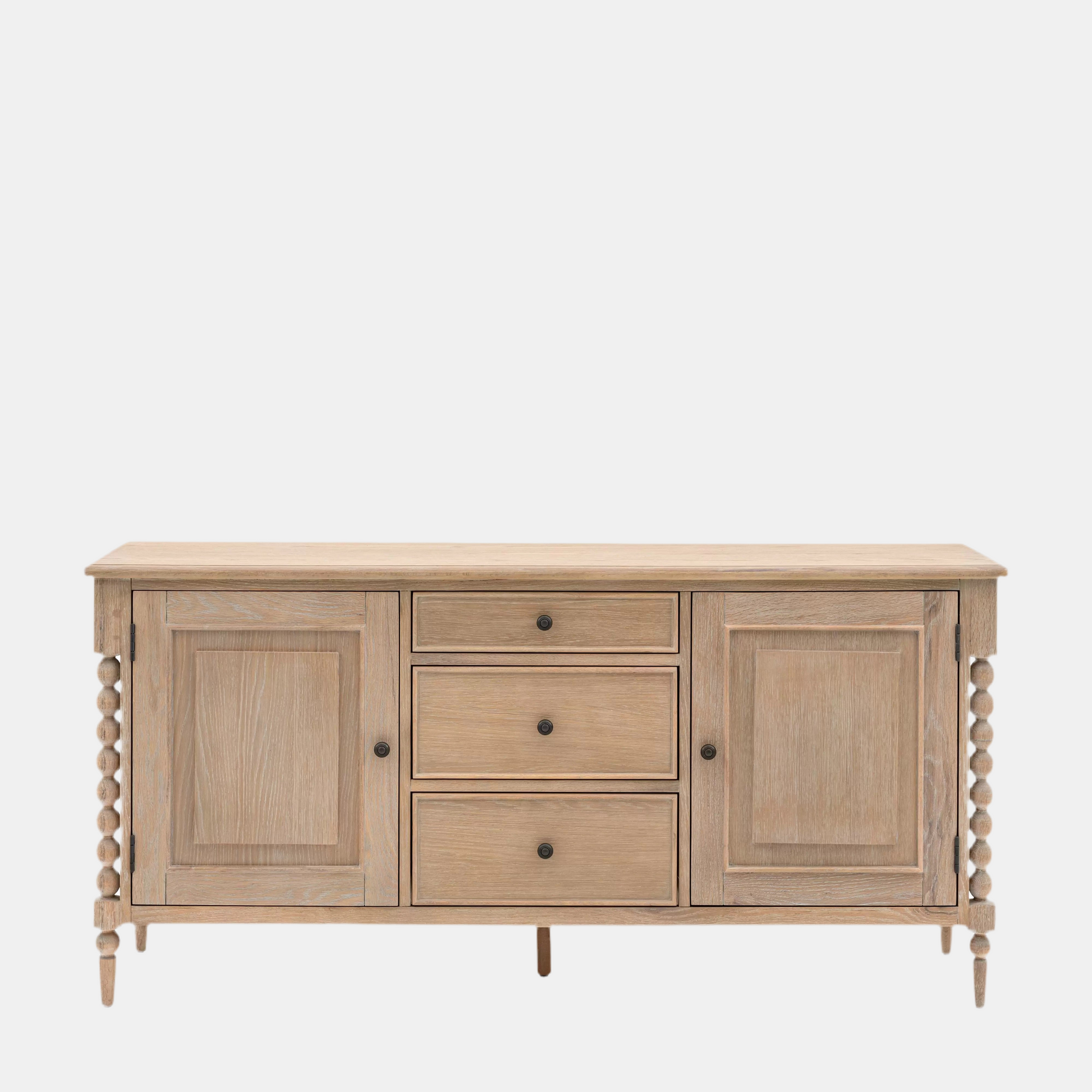Offering practical storage combined with beautiful design, the stunning Quincy Sideboard would make a stylish addition to any living or dining room. The play on a classic look emphasises the hand-crafted bobbin detail down each corner. This eye-catching design feature is created by turning the wood on a lathe, a task carried out by the finest craftsmen. The sideboard is made using beautiful oak solids and veneers where practical, with a very subtle lime wash tone to the finish which is soft and mellow.
