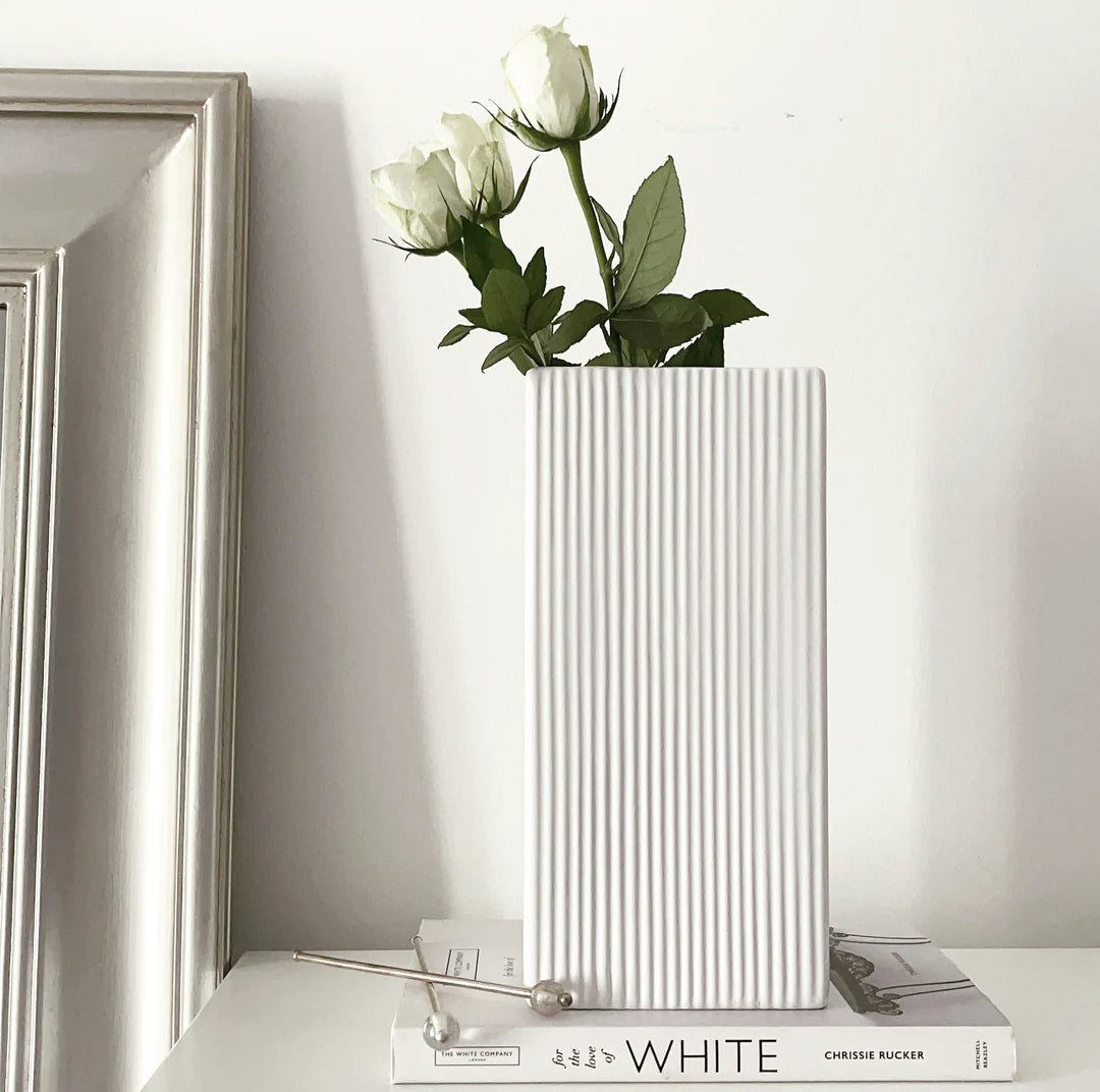 This is a gloss white gently ribbed vase. Simple lines, elegant and classic. This is a real showstopper of a vase.