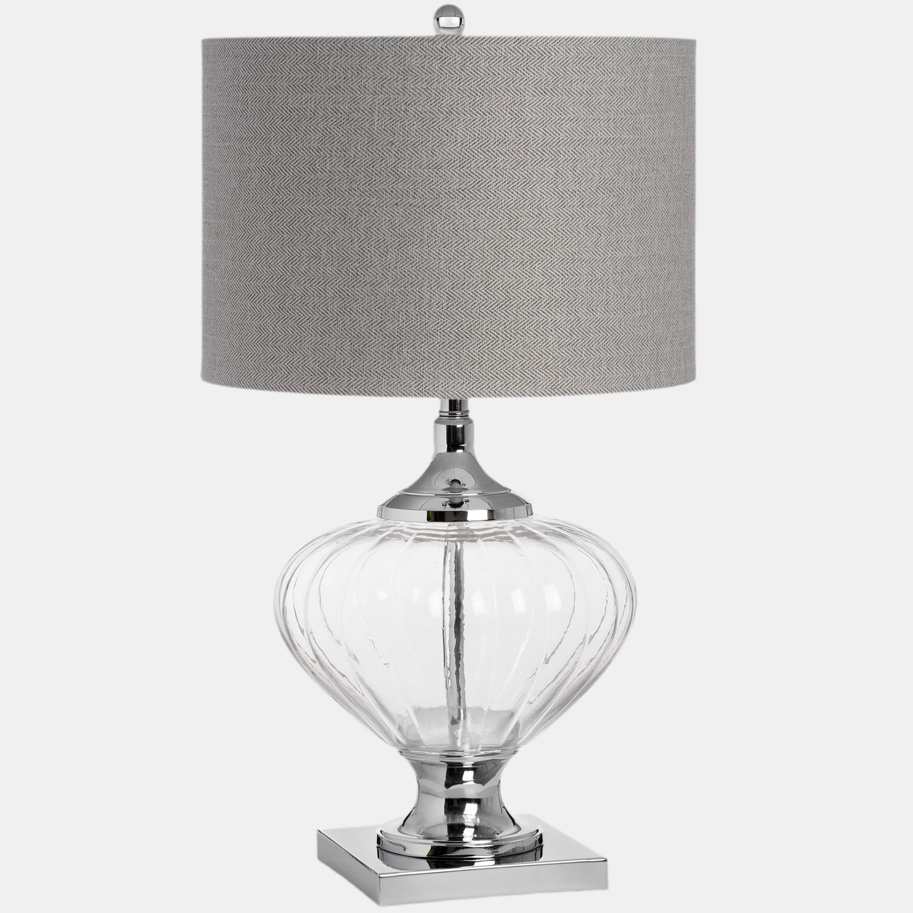 A classic lamp which features a timeless herringbone shade and a fluted glass base with chrome finishes. Suitable for any interior scheme.