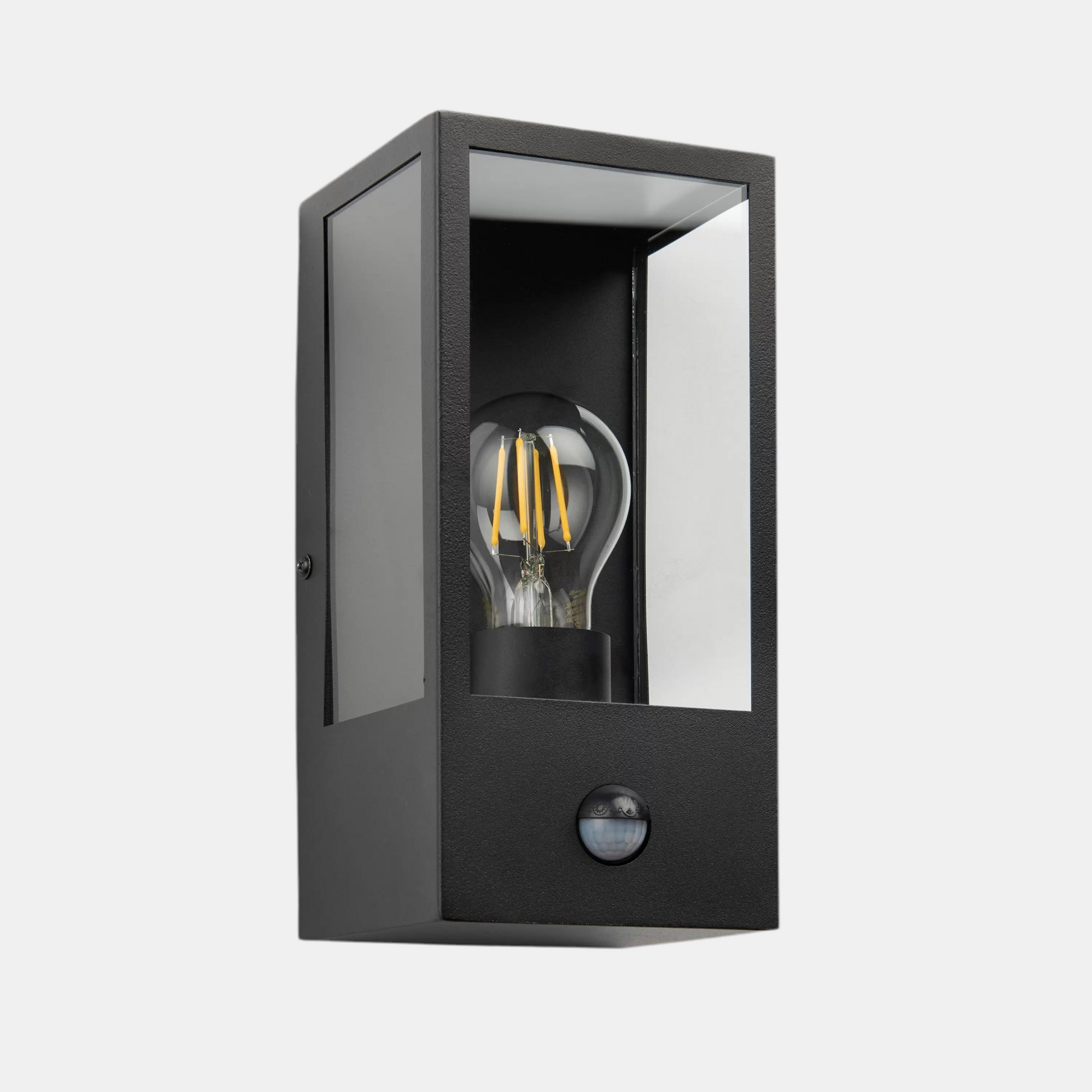 A timeless and classic style outdoor wall light, fashioned as a box lantern with sleek matt black painted stainless steel edges and bevelled edge glass panels. 10-2000 lux and 110º detection, this is IP44 rated for safe exterior use and perfectly pairs with E27 filament lamps. Built-in manual override for the functional motion sensor, with an adjustable 5 sec - 5 min timer function.