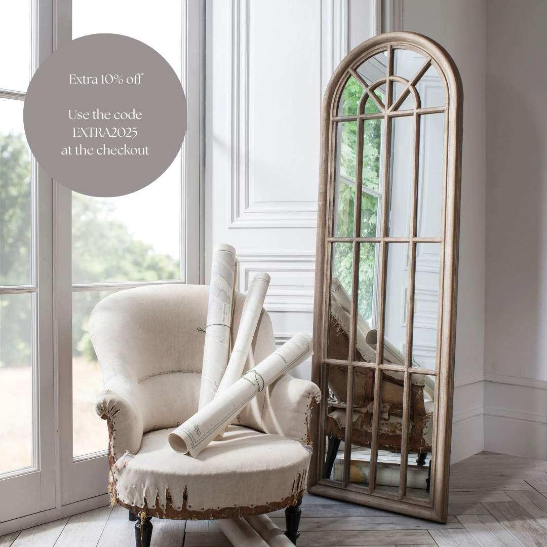 Charming, panelled window mirror in a weathered finish.